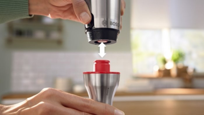 Pozwala na bezproblemowe i bardzo wygodne odłączenie końcówek od korpusu urządzenia. Po zakończeniu pracy uwolnij elementy wyposażenia jednym kliknięciem. Teraz możesz je szybko i łatwo wyczyścić pod bieżącą wodą lub w zmywarce.