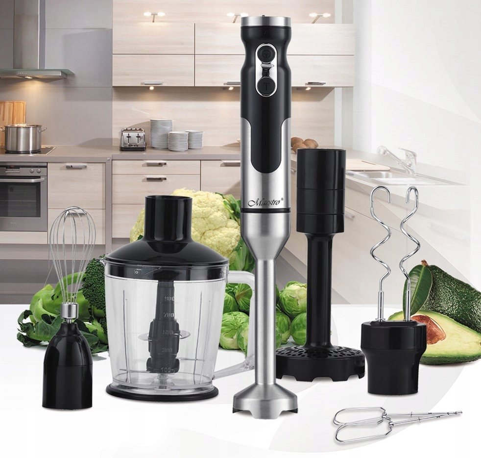 Blender ręczny Maestro Pełen zestaw 1000W to doskonałe narzędzie do Twojej kuchni. Z mocą 1000W, ten blender jest gotowy, aby sprostać każdej kulinarniej wyzwaniu.
