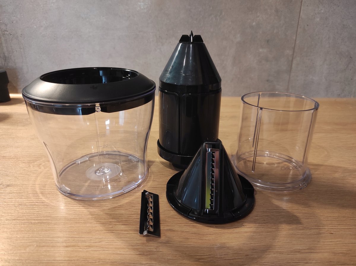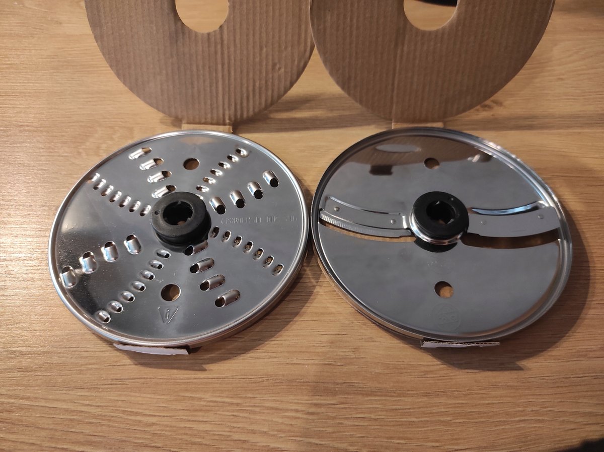 - Pozostałe: Dodatkowe ostrza i tarcze do krojenia, Spiralizator, Tłuczek, Zestaw naczyń