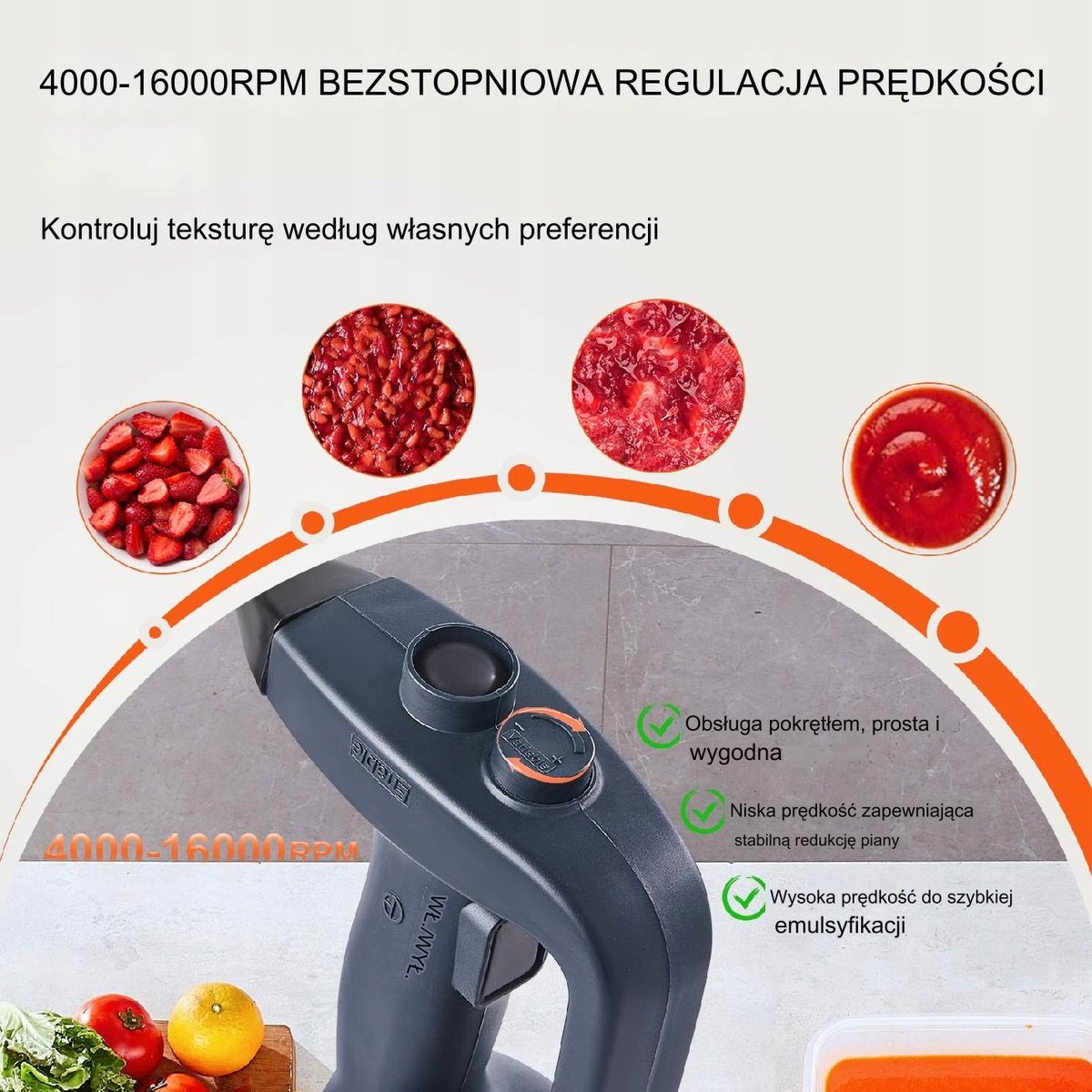 Ergonomiczna rączka zapewnia wygodny i pewny chwyt, co ułatwia długotrwałe użytkowanie bez zmęczenia. Blender jest lekki i łatwy do manewrowania, co pozwala na precyzyjne miksowanie w głębokich garnkach i pojemnikach. To doskonałe narzędzie do przygotowywania kremów, zup i sosów.