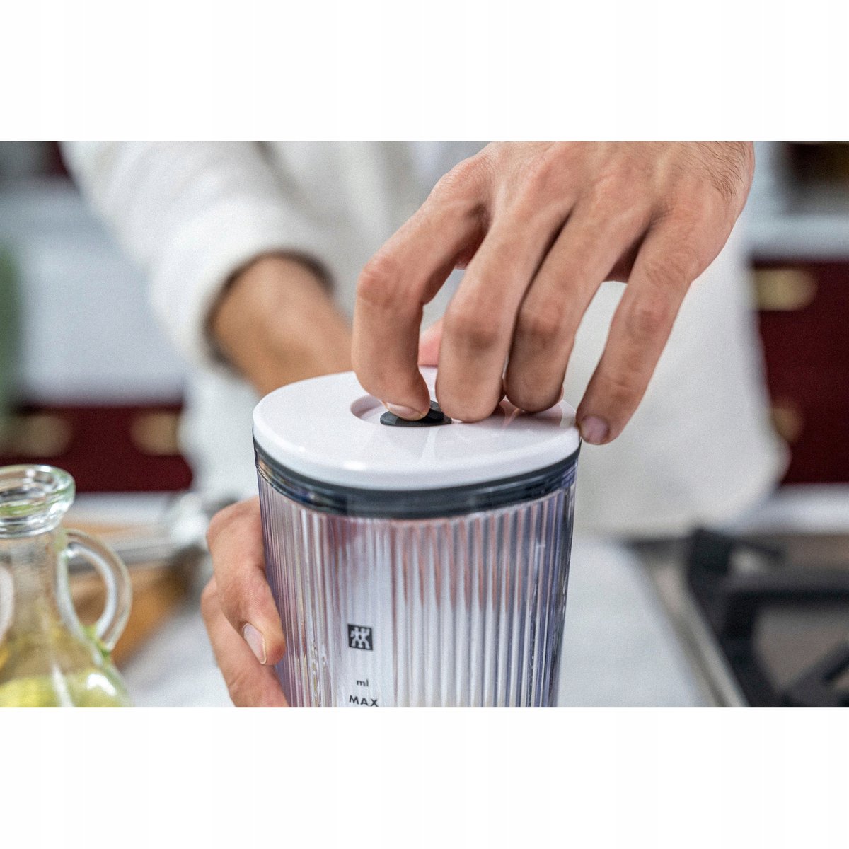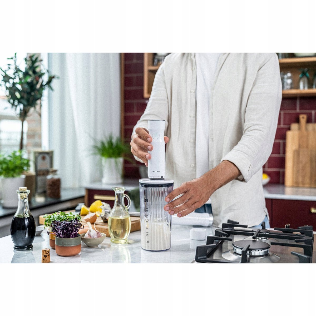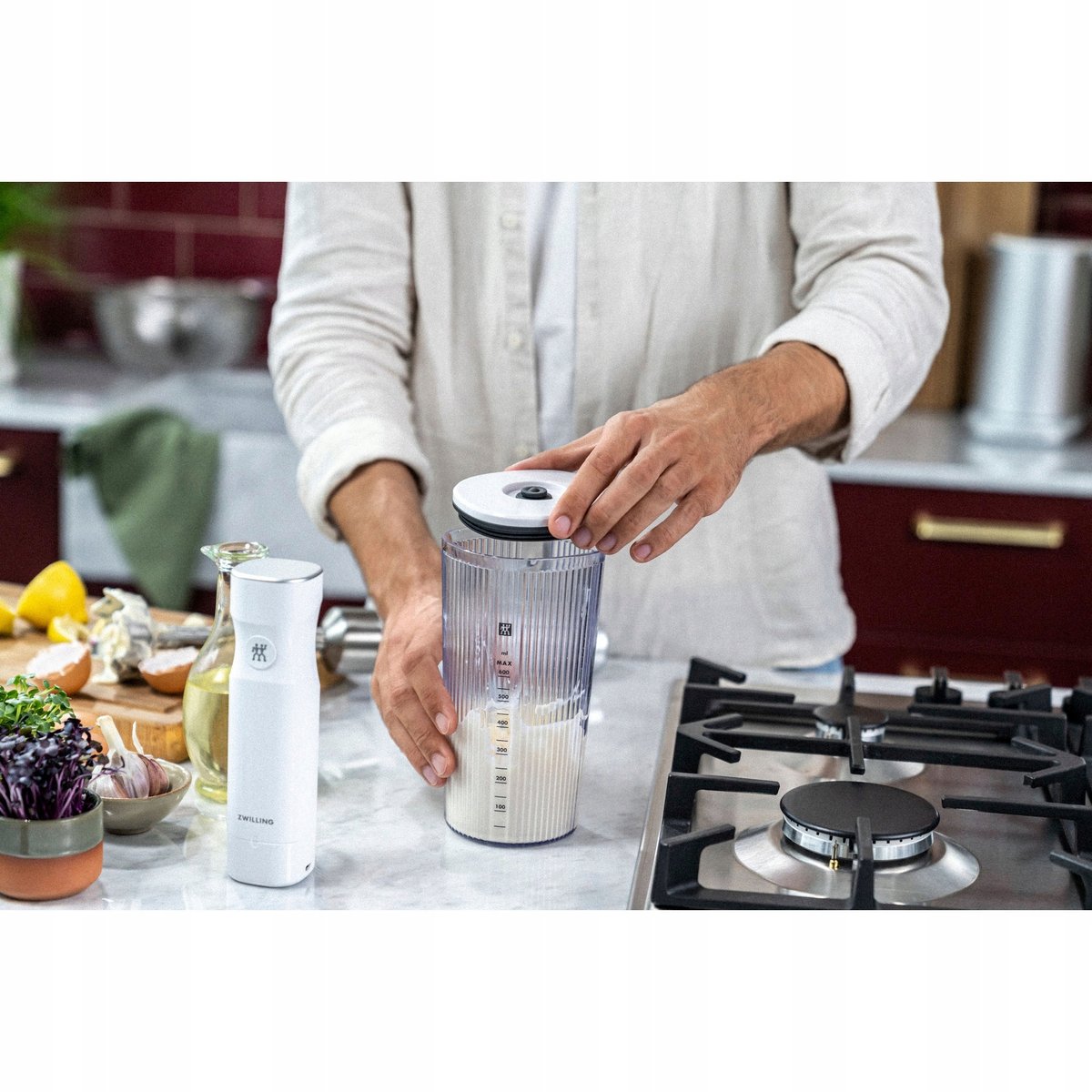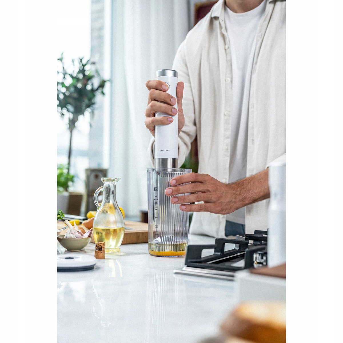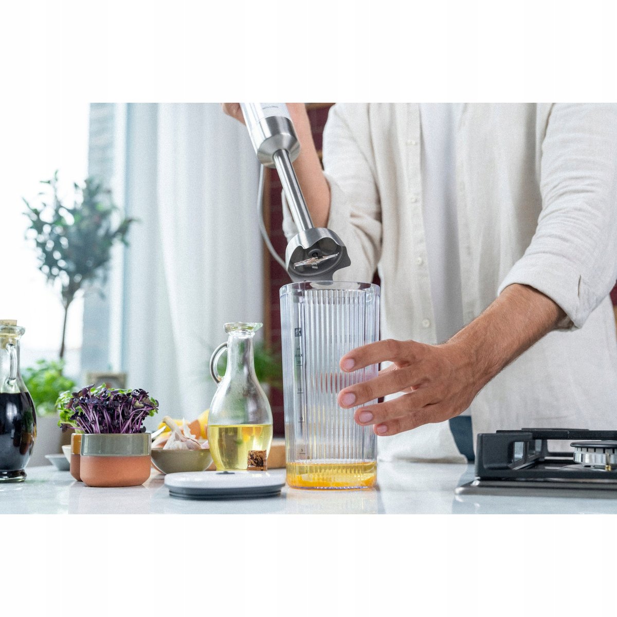 Jeden blender, jeden dzbanek do blendowania, nieskończone możliwości: Blender ręczny ZWILLING ENFINIGY z miarką jest poręczny, praktyczny i niezwykle uniwersalny. Niezależnie od tego, czy chodzi o smoothie, sos czy pokarm dla dziecka: napędzany potężnym silnikiem o mocy 800 W, blender ręczny ze stali nierdzewnej z dziewięcioma ustawieniami prędkości, w tym funkcją Pulse, oferuje idealne ustawienie dla Twoich potrzeb. Ostrze ZWILLING z “zębami piranii” zapewnia najdoskonalsze rezultaty blendowania. Specjalny kształt usprawnia obsługę i zapewnia jeszcze lepsze rozdrobnienie Twoich potraw. Idealnie sprawdza się to w dołączonym do zestawu dzbanku, ale długi blender ręczny zapewnia również doskonałe rezultaty we wszystkich garnkach. Dzbanek z miarką wykonany z tworzywa sztucznego wolnego od BPA mieści 600 ml i ma pokrywkę kompatybilną z produktami próżniowymi ZWILLING FRESH & SAVE – można przygotować sosy rano, usunąć powietrze pompą próżniową i cieszyć się nimi na świeżo wieczorem. Inne zalety blendera ręcznego: funkcja miękkiego startu, która ogranicza rozpryskiwanie, intuicyjne sterowanie za pomocą 2 przycisków oraz 1.2-metrowy kabel, który daje nową swobodę w kuchni podczas korzystania z blendera ręcznego.