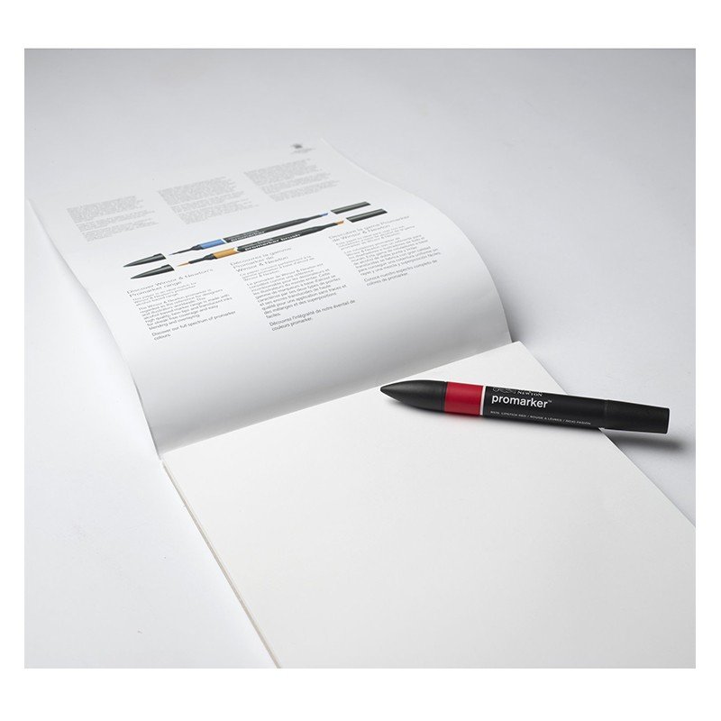 Blok rysunkowy Winsor & Newton do pisaków i markerów. Specjalnie spreparowany papier o gramaturze 160 g/m², zapewnia optymalne efekty pracy z markerami takimi jak Promarker, Promarker Brush oraz Kurecolor Twin WS. Lekko śliski papier pozostawia odpowiednią ilość tuszu na powierzchni kartki – pozwala nakładać kolory warstwami bez obawy o mechaniczne uszkodzenia arkusza. Biel kartki bardzo dobrze eksponuje i uwydatnia nakładane barwy. Tylna okładka wykonana jest z grubego, sztywnego kartonu, który z powodzeniem zastępuje podkładkę podczas pracy na przykład w plenerze.