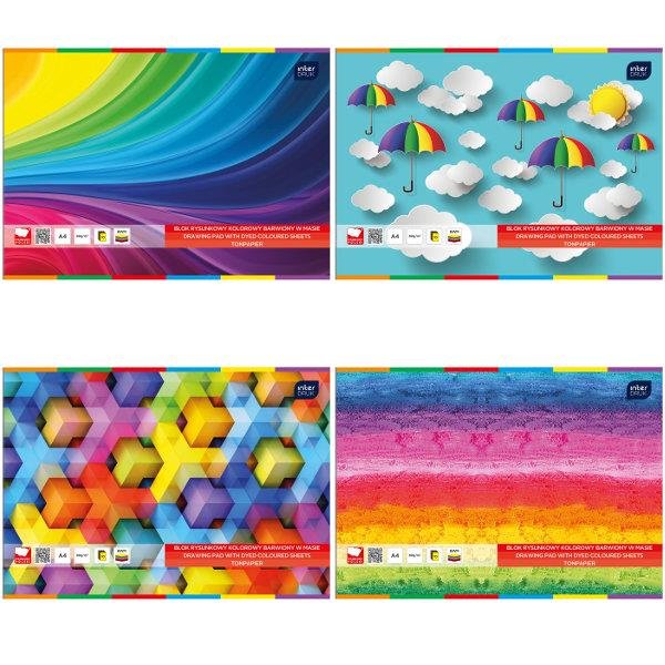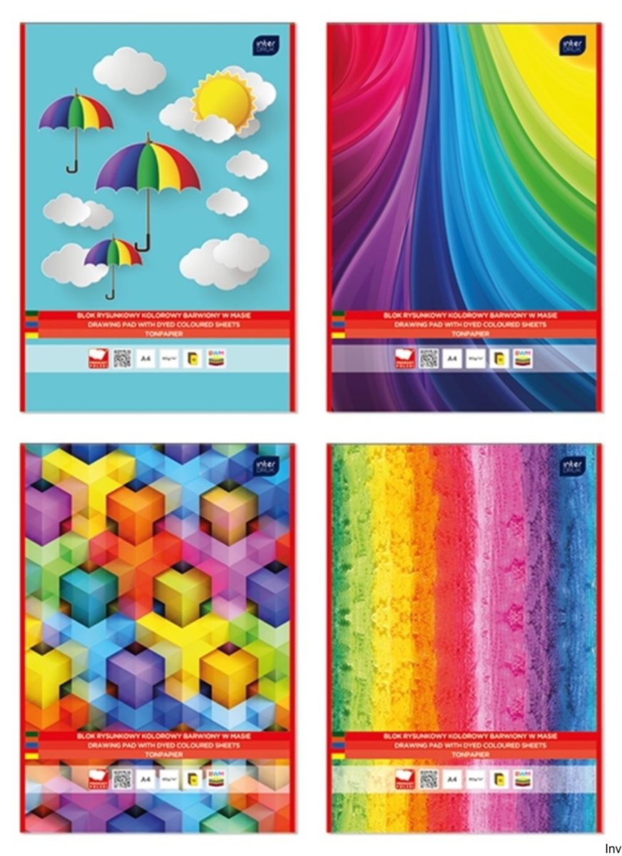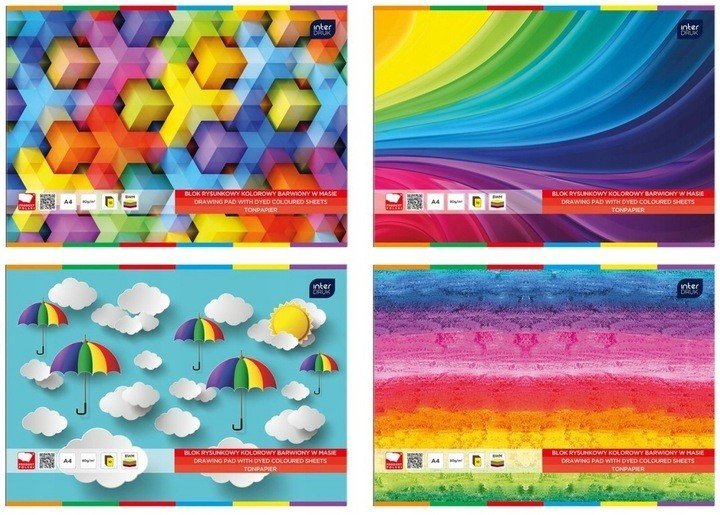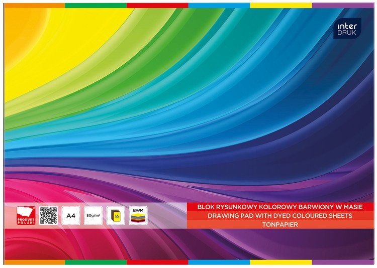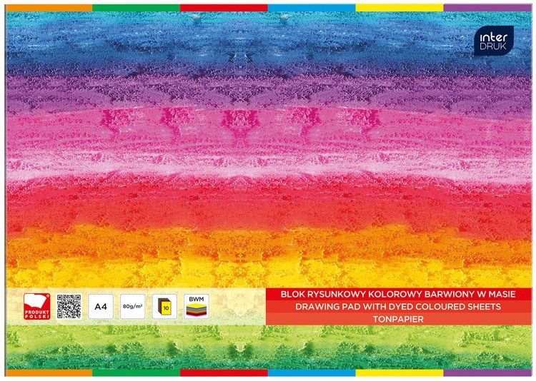 Blok rysunkowy A4 10 kol.barwiony w masie INTERDRUK *258304 10 kolorowych kartek. Wysokiej jakości papier. Całość na podkładzie z grubej tektury. Kolorowe okładki z papieru kredowego, przyciągające ...
