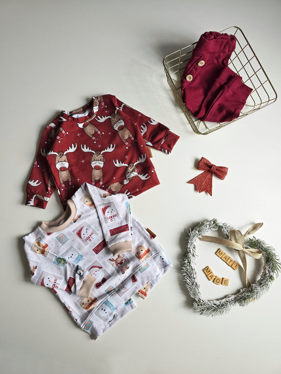 Bluza świąteczna dla dziecka „Reindeer Joy” Świąteczna bluza Reindeer Joy to wyjątkowy element garderoby na czas Bożego Narodzenia. Uroczy nadruk z reniferem i czerwonym noskiem sprawia, że każde dziecko będzie wyglądało radośnie i stylowo podczas rodzinnych spotkań czy świątecznych sesji zdjęciowych. Bluza została uszyta w naszej pracowni z wysokiej jakości dzianiny (92% bawełna, 8% elastan), która jest miękka, elastyczna i wygodna w noszeniu. Dzięki certyfikatowi Oeko-Tex Standard 100 masz pewność, że materiał jest bezpieczny nawet dla wrażliwej skóry dziecka. Dlaczego warto?