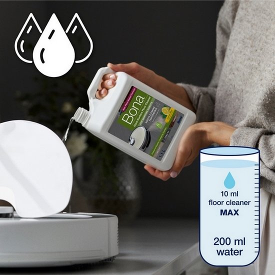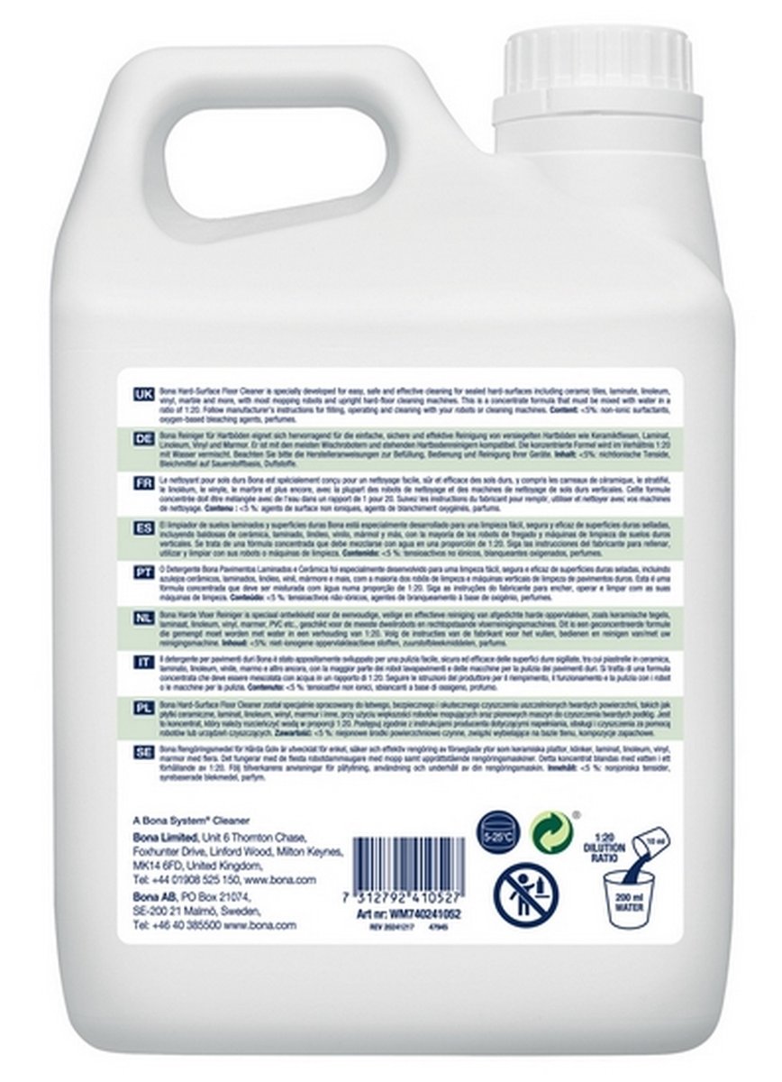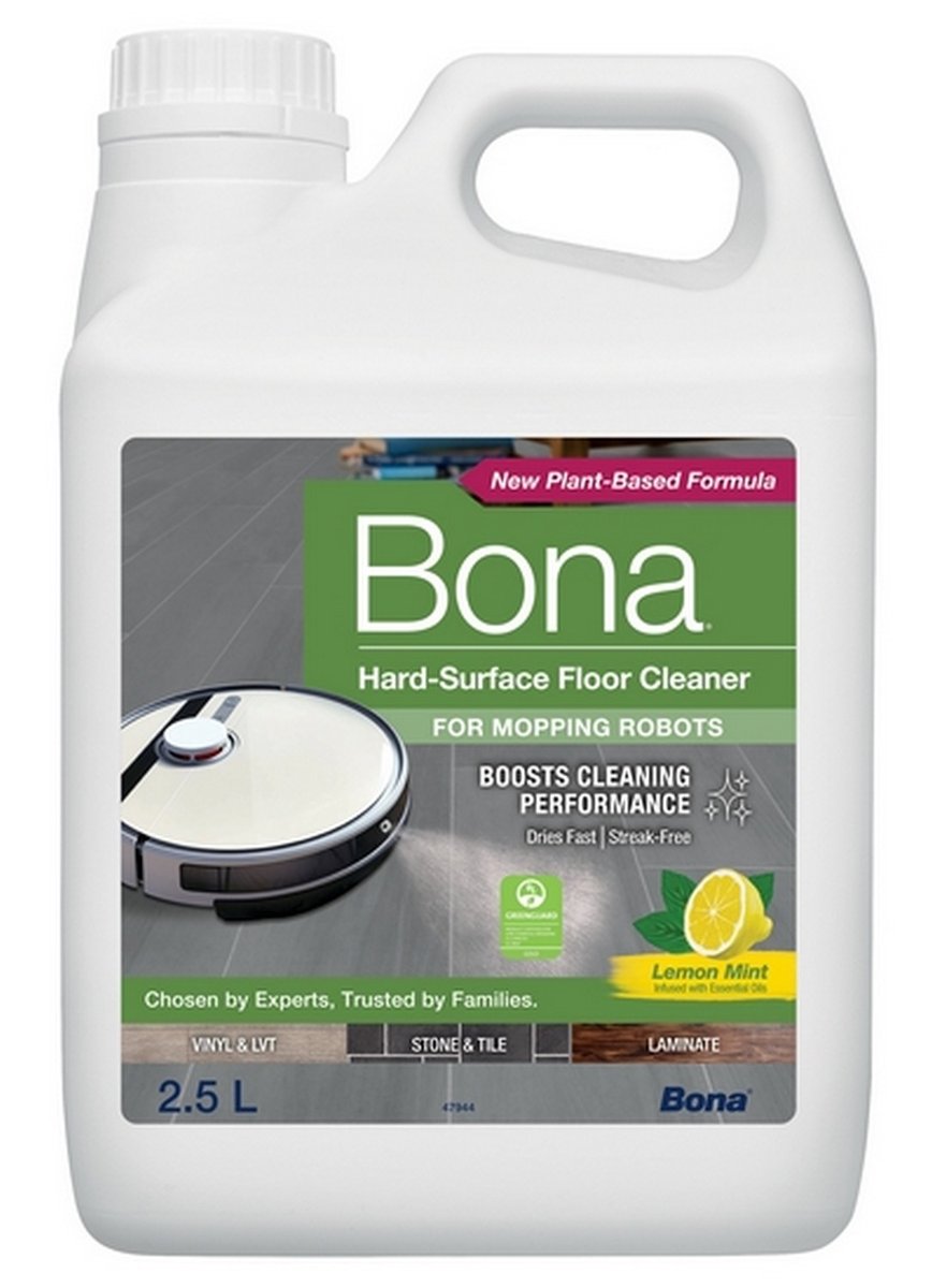 Bona Hard-Surfase Floor Cleaner został specjalnie opracowany do łatwego, bezpiecznego i skutecznego czyszczenia uszczelnionych twardych powierzchni, takich jak płytki ceramiczne, laminat, winyl, marmur i linoleum przy użyciu większości robotów mopujących oraz pionowych urządzeń do czyszczenia twardych podłóg. Jest to koncentrat, który należy rozcieńczyć wodą w proporcji 1:20.