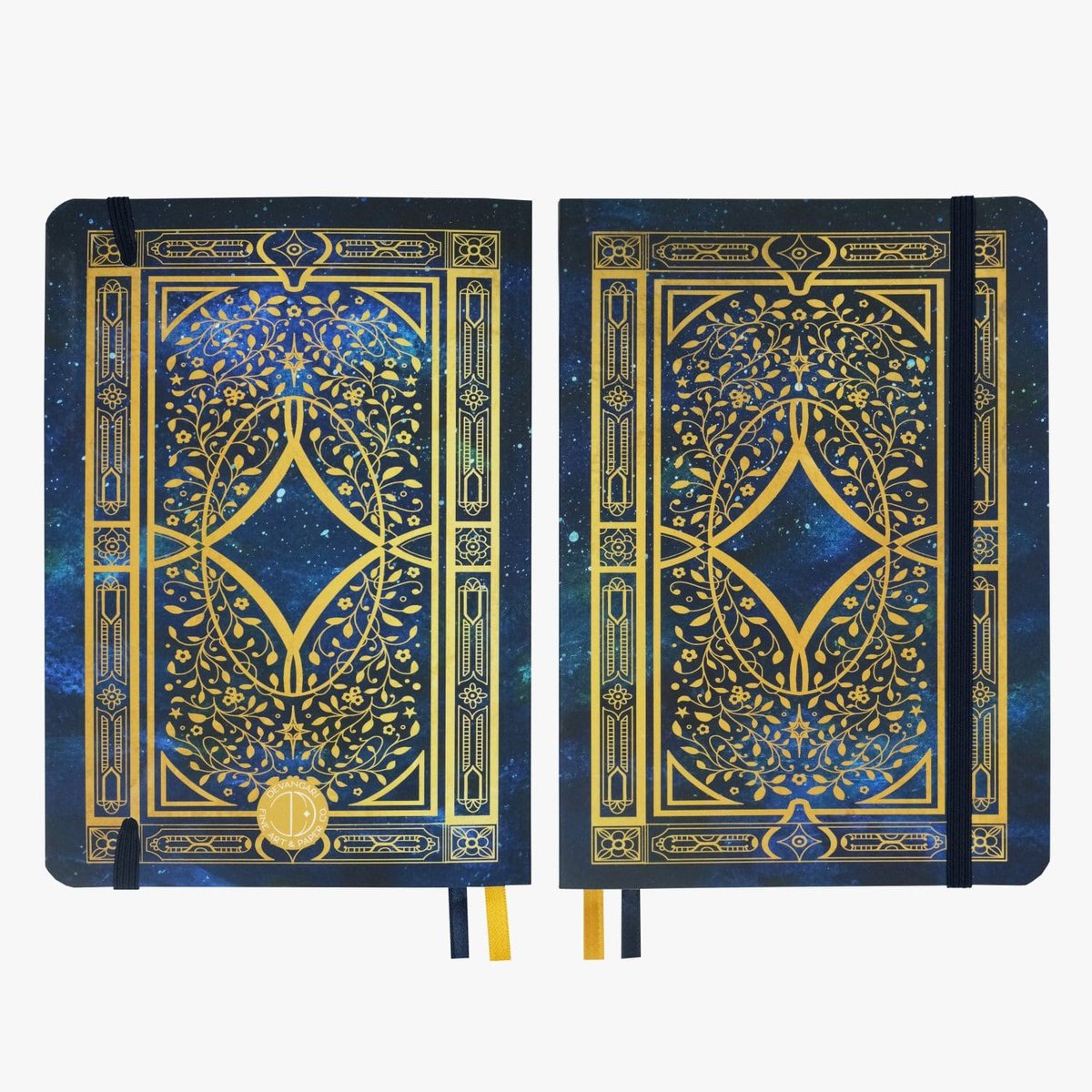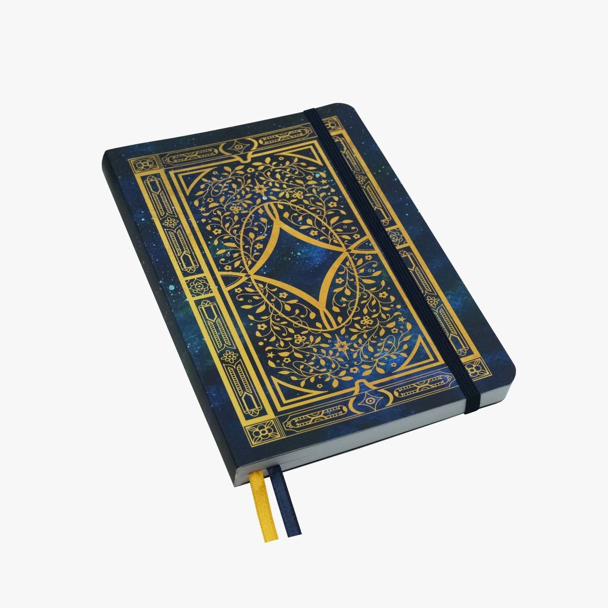 Obraz na okładce to połączenie pracy namalowanej akwarelami i odręcznego rysunku. Głębokie odcienie błękitu i zieleni tworzą zachwycające tło dla misternych złotych detali. Wielowarstwowy projekt, w którym nic nie jest oczywiste, przypomina legendarne zbiory zaklęć i tajemnic. Wybierz notes Book of Wonders na towarzysza swojej codzienności. Notatnik przypomni Ci, że Twoje plany, cele i marzenia są niezwykłe i zasługują na to, by je zrealizować.