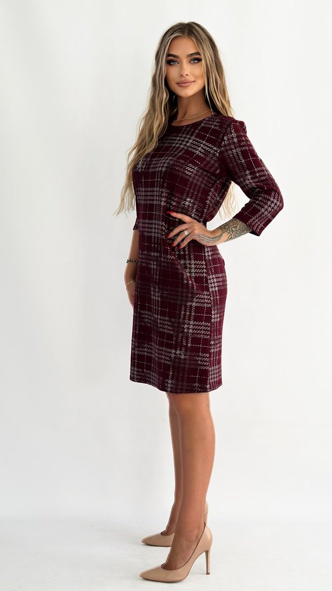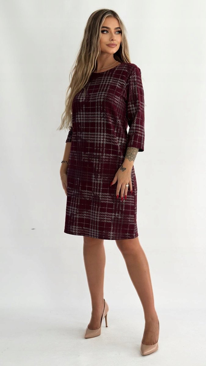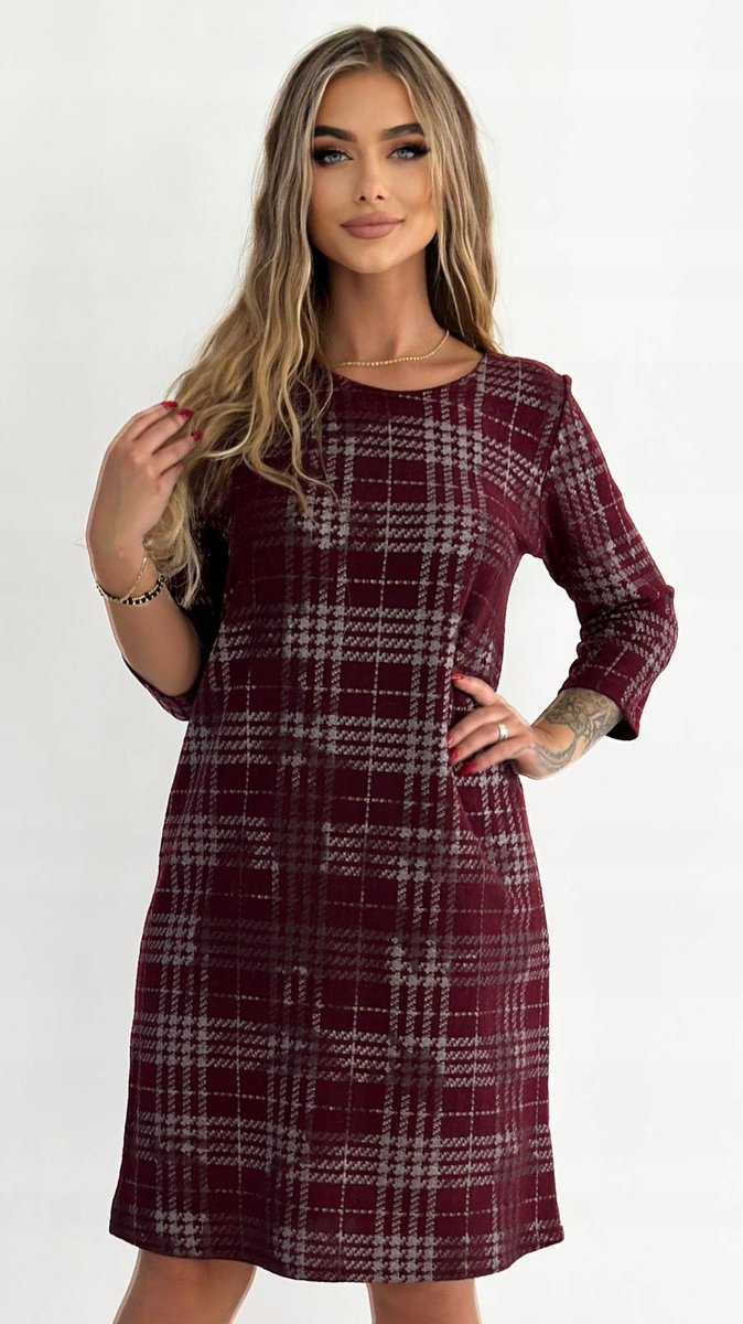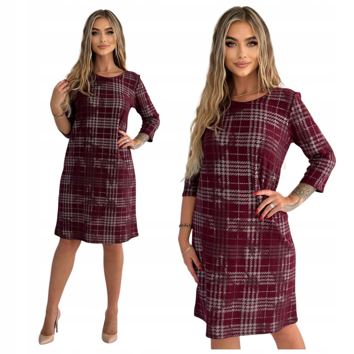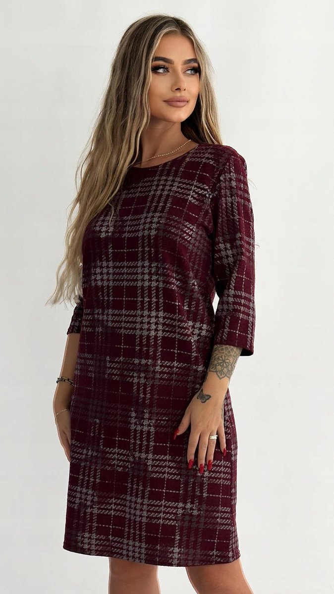 BORDOWA ŚLICZNA PROSTA SUKIENKA W KRATKĘ ROZMIAR XL