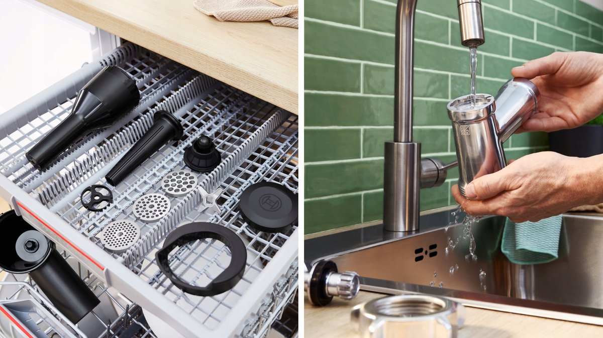- Łatwe czyszczenie. Sam produkt został zaprojektowany tak, aby szybko i łatwo wytrzeć powierzchnię po pracy. Ponadto większość akcesoriów, w tym sita i nożyk można myć w zmywarce.