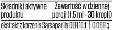 woda, substancja emulgujaca – lecytyna (z soi), ekstrakt z korzeniaSarsaparilla (Smilax aristolochiaefolia) DER 10:1, przeciwutleniacz: alfa-tokoferol, konserwant: sorbinian potasu.