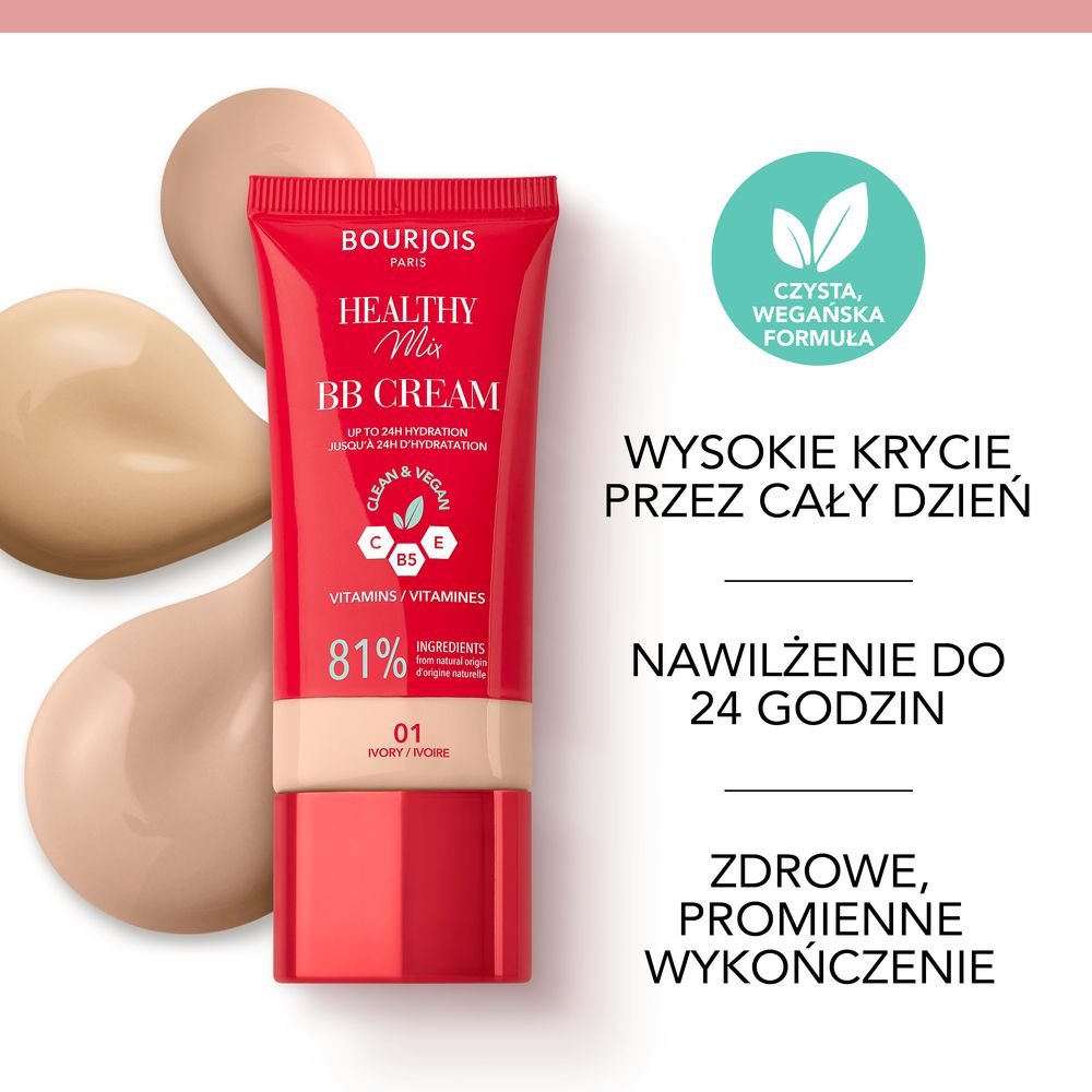 Kryjący krem BB Healthy Mix pielęgnuje Twoją skórę zapewniając jednocześnie pełne, równomierne krycie o promiennym, wykończeniu. Z łatwością wyrównuje koloryt skóry i zmniejsza widoczność porów, skutecznie tuszując oznaki zmęczenia oraz niedoskonałości, przebarwienia i zaczerwienienia. Czysta, wegańska formuła stworzona w 81% ze składników pochodzenia naturalnego zapewnia nieskazitelne, a zarazem niezwykle naturalne wykończenie oraz komfort noszenia przez cały dzień. Ekstrakt z jagód Schisandra (Cytryniec Chiński) działa kojąco na skórę, zielona soczewica zmniejsza widoczność porów i reguluje wydzielanie sebum, a kompleks witamin C, E i B5 wykazuje działanie antyoksydacyjne. Bourjois – kultowa francuska marka kosmetyczno-perfumiarska – już od 160 lat czerpie inspirację z paryskiego szyku oraz radości towarzyszącej dbaniu o urodę. Dodajemy kobietom pewności siebie oraz odwagi do tego, by pokazywać swoją figlarną stronę i bez skrępowania eksperymentować z makijażem – wierzymy, że im lepiej się bawisz, tym większym pięknem promieniejesz. Marka Bourjois – obecna na 39 rynkach w różnych zakątkach świata – zyskała renomę jednego z czołowych ekspertów w dziedzinie innowacji makijażowych i koloru. Tworzymy produkty – takie jak kultowy róż Little Round Pot czy tusze do rzęs Twist Up The Volume – których zadaniem jest wprawić Cię w doskonały nastrój i zachęcić do dobrej zabawy. Wszystkie produkty z linii Healthy Mix mają czysty skład, co oznacza, że ich formuła wywiera korzystny wpływ na skórę, zawiera składniki pochodzenia naturalnego, jest wegańska i nie zawiera składników pochodzenia zwierzęcego ani produktów ubocznych pochodzenia zwierzęcego. Każde opakowanie zostało stworzone z wykorzystaniem materiałów pokonsumpcyjnych pochodzących z recyklingu.