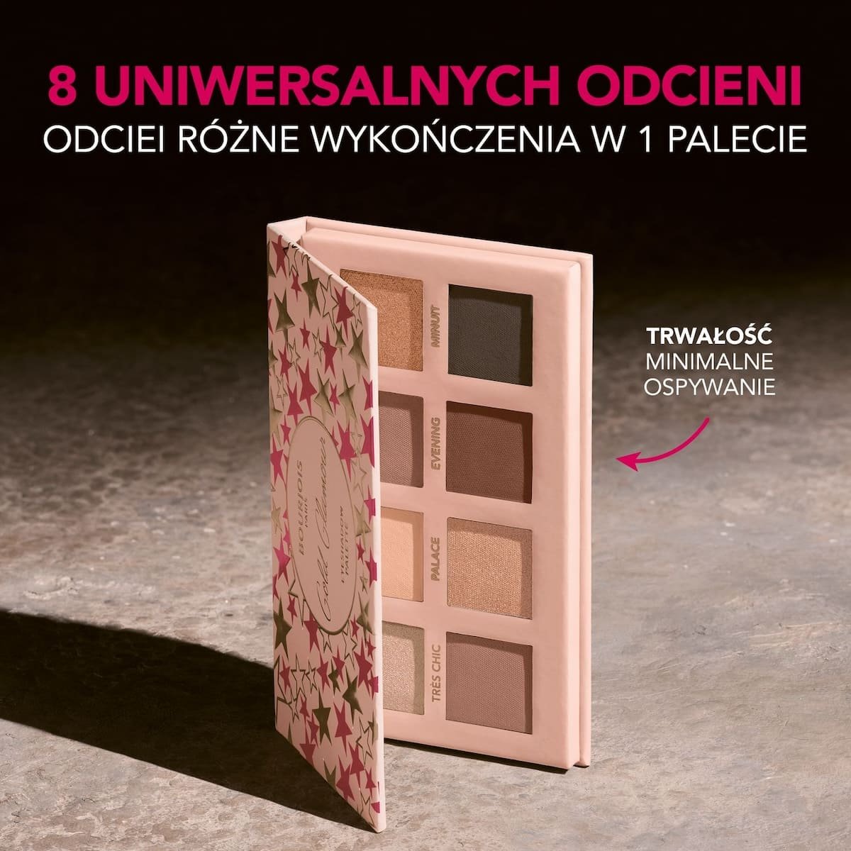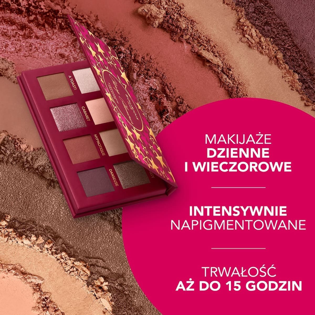 Cienie o różnych wykończeniach; mogą być używane jako liner lub rozświetlacz; długotrwały efekt, nieosypująca się formuła