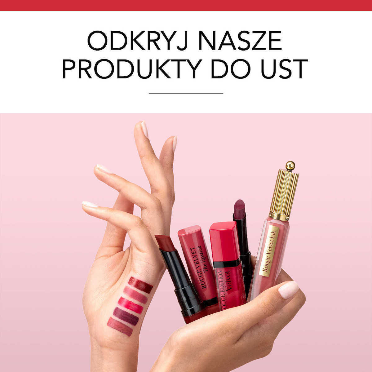 Trwała, matowa szminka Bourjois Velvet Rouge Edition na pewno na dobre zagości w Twojej kosmetyczce. Niezastąpiona, gdy zechcesz uzupełnić makijaż pięknym akcentem na ustach. Miękki aplikator w formie gąbeczki, idealnie dopasowujący się do ust Intensywny, przyjemny, matowy i długotrwały kolor, który utrzymuje się na ustach do 24 godzin