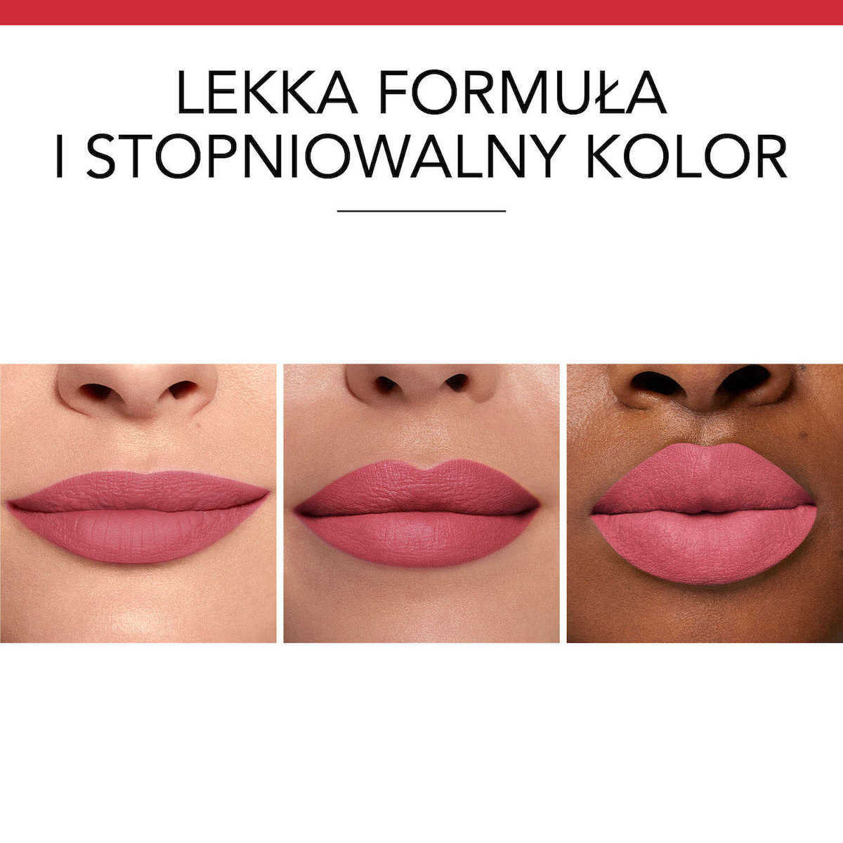 Ulepszona formuła zawierająca 1/4 czystych pigmentów zapewnia odważny, intensywny kolor Miękka, rozpływająca się konsystencja zawiera 1/4 aksamitnego koncentratu, który sprawia, że usta są matowe, gładkie i miękkie Nieskazitelny efekt, który utrzymuje się nawet do 24 godzin