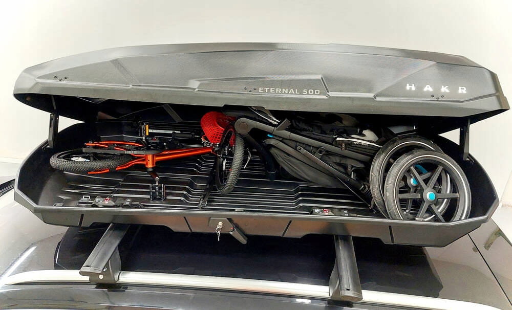 Funkcjonalny box dachowy Hakr Eternal 500 został wyposażony w zabezpieczenia, które skutecznie chronią przewożony sprzęt. W boxie można umieścić deskę snowboardową lub narty oraz niestandardowe bagaże, takie jak składany wózek dziecięcy. Skrzynię Eternal można otworzyć z obu stron, co sprawia, że załadunek i rozładunek jest wygodniejszy i bezpieczniejszy.