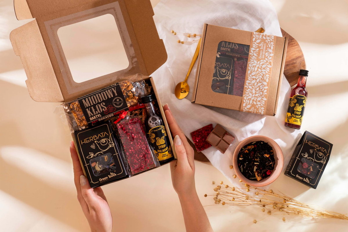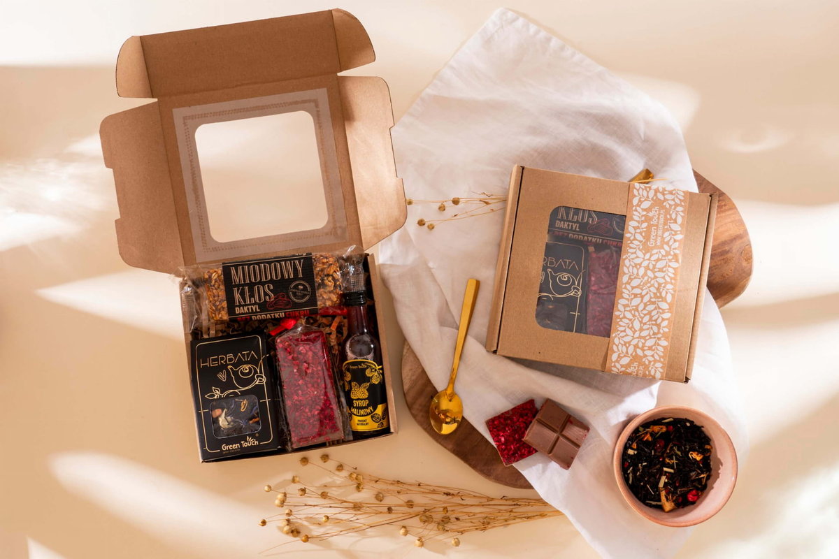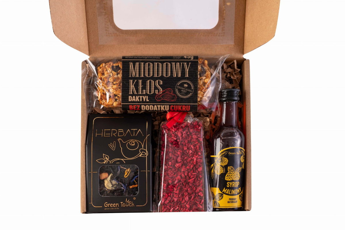 Box prezentowy kraftowy syrop malinowy zestaw herbata czekolada lio baton