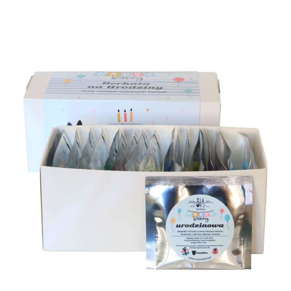 Urodziny przyjaciółki, siostry, dziadka, a może narzeczonego? Wiemy, że wybór prezentu urodzinowego to ciężki orzech do zgryzienia, ale żeby ułatwić Ci wybór stworzyliśmy zestaw – Box z herbatą na urodziny! To 20 saszetek z herbatą o różnych smakach, zamkniętych w eleganckim opakowaniu z urodzinowymi akcentami. Prezent zachwyci każdego solenizanta – wielbiciela herbaty, gdy każdego dnia będzie mógł sięgać po pełną smaku i aromatu herbatę najwyższej jakości. Szeroki wybór smaków sprawi, że codziennie będzie miał szansę przenieść się w inny świat herbaty – tropikalna pina colada, tradycyjna czarna, a może ziołowa, napawającą pozytywną energią na dobry początek dnia? Pozwól wybrać obdarowanemu i spraw radość z poznawania nowych smaków herbaty!
