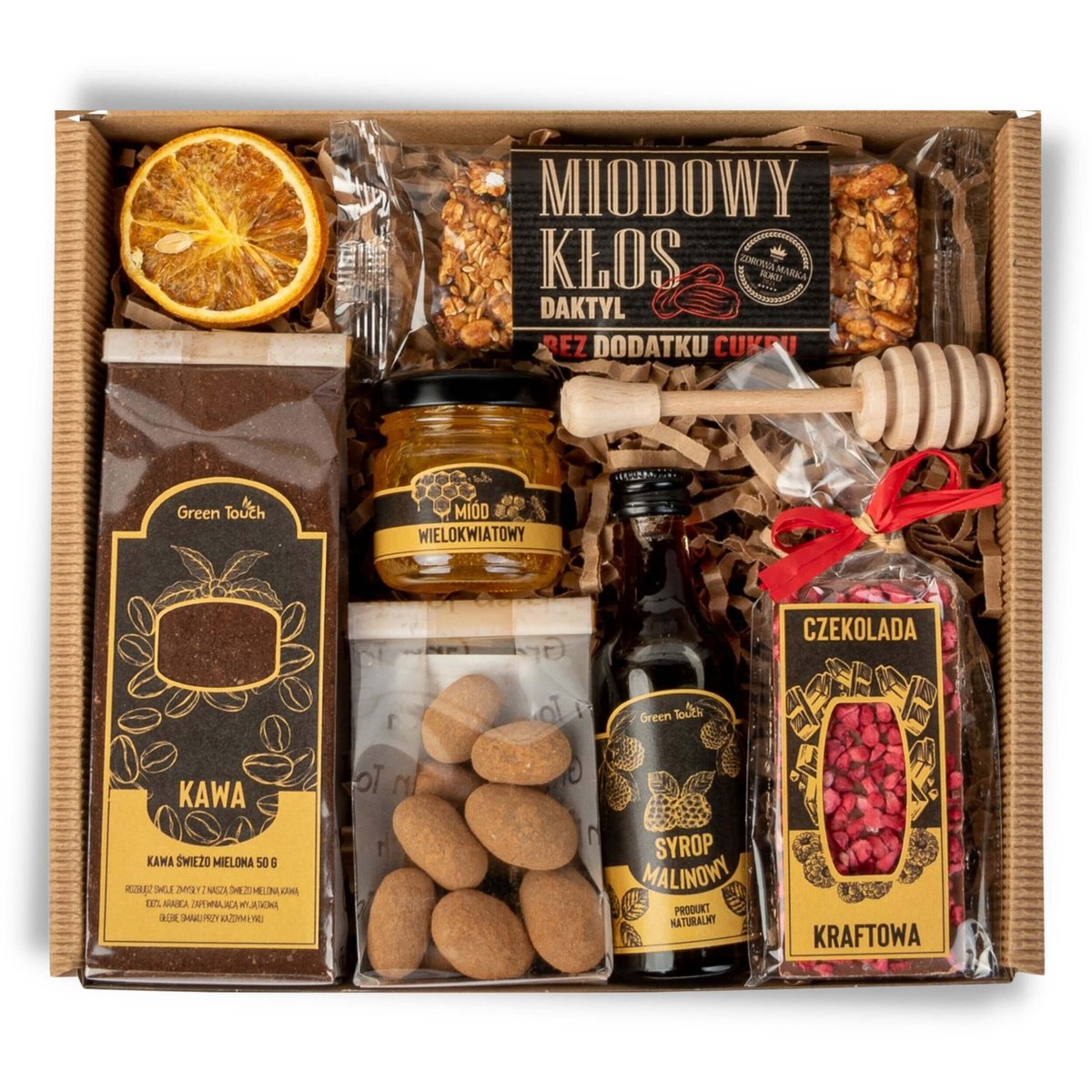 Box zestaw prezentowy prezent kawa miód syrop czekolada baton migdały kraft