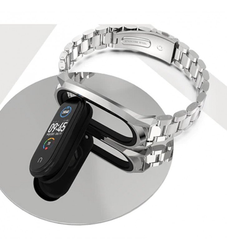 Bransoletka mesh do zegarka smartband wraz z zintegrowana kopertą, wykonana z stali szlachetnej posiadająca podwojną blokadę zapięcia.