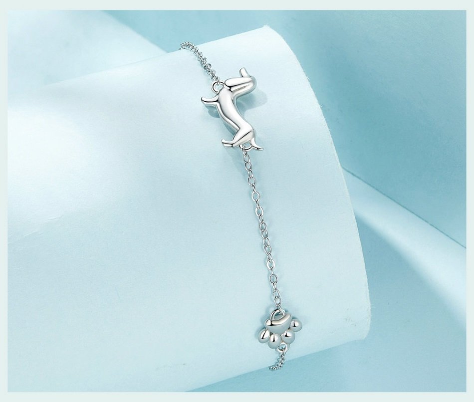Bransoletka srebrna damska łańcuszek srebro jamnik pies szczeniak 925 york. Materiał srebro próby 925,długoć regulowna 15 cm - 21 cm.