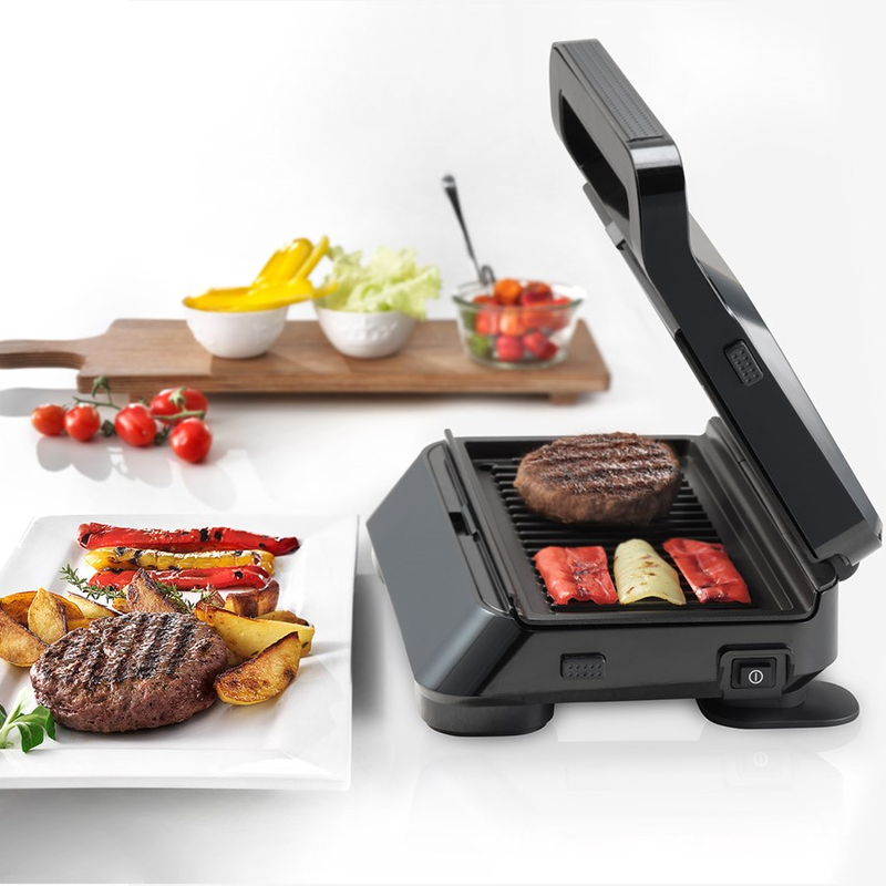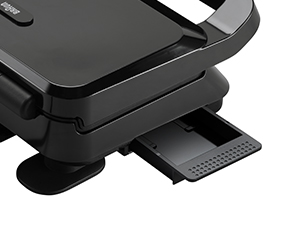 Obsługa urządzenia jest komfortowa, bezpieczna i intuicyjna. Także jego czyszczenie jest bezproblemowe i zajmuje mało czasu. Odlewane płytki, pokryte PTFE czyli teflonem przeznaczonym do kontaktu z żywnością, łatwo wyciąga się z opiekacza. Można je wygodnie myć w zmywarce (zapoznaj się z instrukcją), a zintegrowana tacka ociekowa skutecznie zbiera olej i wszelki tłuszcz z pieczenia i grillowania.