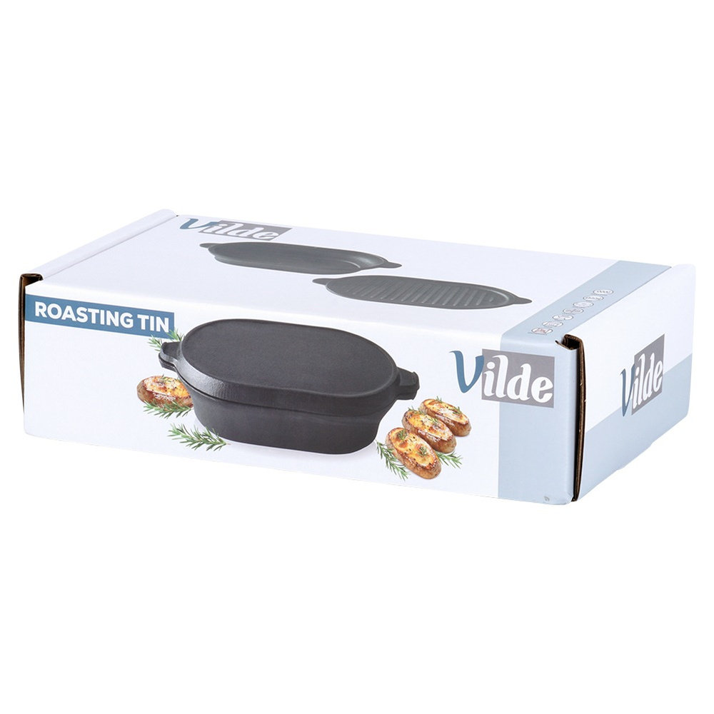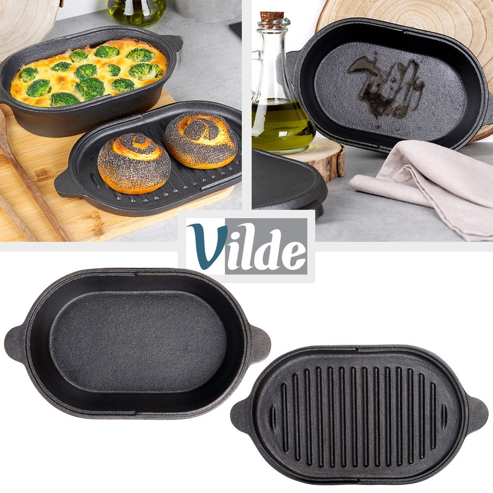 Brytfanna z pokrywką, która służy również jako osobne naczynie znajdzie szerokie zastosowanie w kuchni. Wykonana z wytrzymałych materiałów. W brytfannie przygotujemy różnego rodzaju mięsa, ryby czy warzywa. Zestaw ten jest niezwykle przydatny w każdej kuchni. ❗️UWAGA! Po każdym użyciu umyć, wytrzeć suchą szmatką do sucha i natłuścić - w przeciwnym razie na naczyniu pojawi się rdza, co jest naturalnym procesem dla tego typu materiału. Naczynie nie posiada żadnych powłok typu "teflon". Regularna pielęgnacja zapobiega korozji i zapewnia długotrwałe użytkowanie naczynia. Oryginalny produkt marki Vilde z linii Cast Line. Wyprodukowano zgodnie z europejskimi standardami.