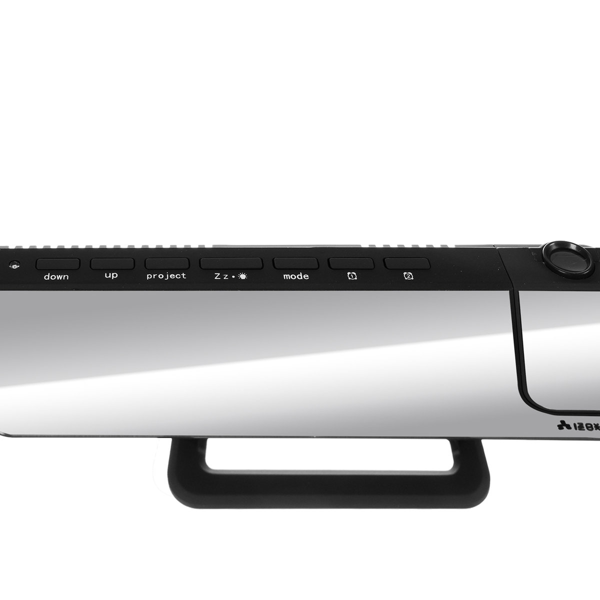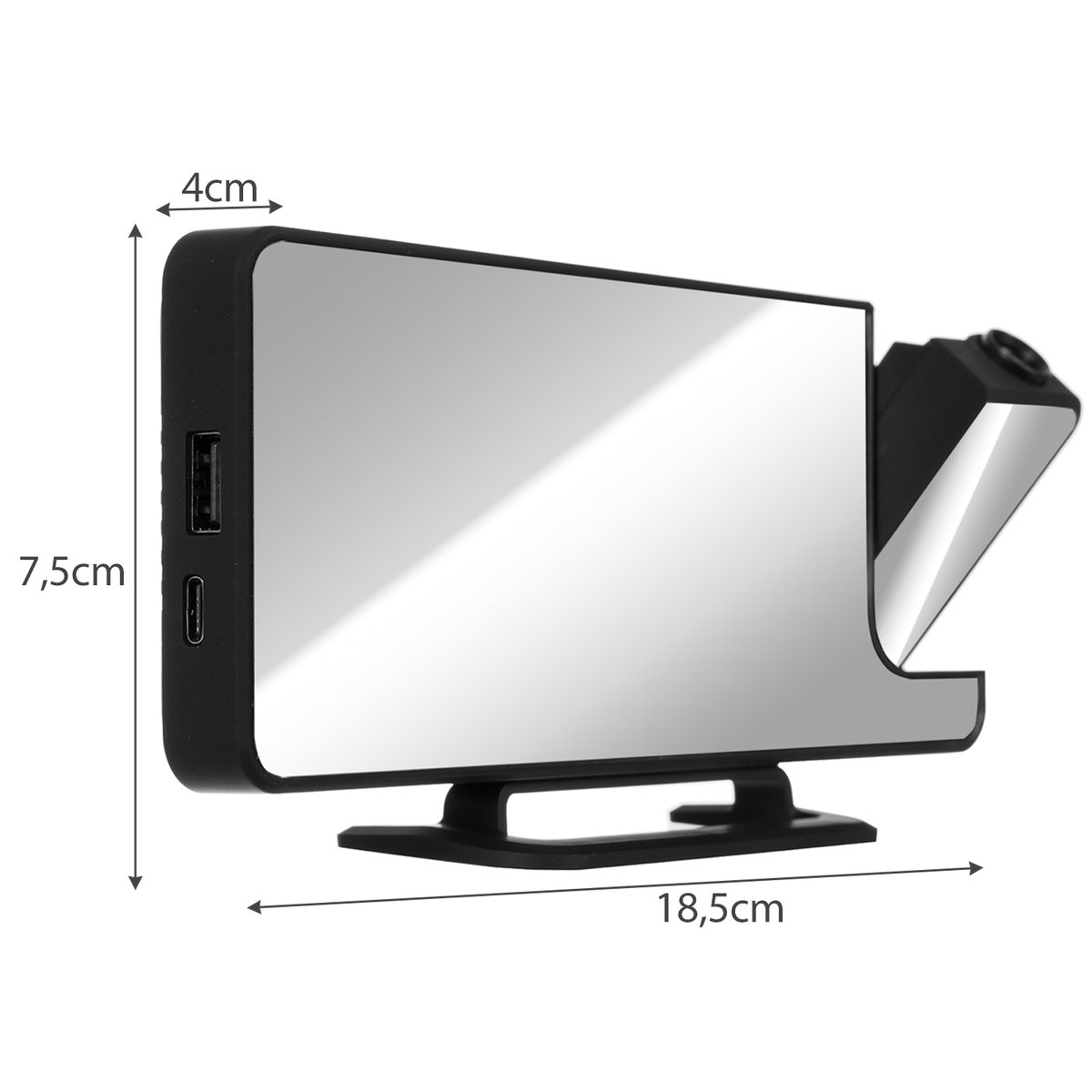- SPECYFIKACJA - materiał: ABS, pozostałe: szkło; kolor: czarny; kolor wyświetlania projektora: czerwony; kolor wyświetlania na zegarze: biały; format wyświetlania godziny: 12h; podświetlenie: LED; nietłukące lusterko: tak; wymiary: 18,5 x 7,5 x 4 cm; waga: 0,144kg; waga w opakowaniu: 0,238kg.