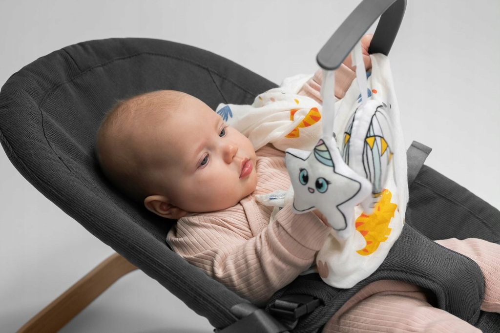 Dwie przyjemne zawieszki będą doskonałym towarzyszem zabaw Twojego Malucha. Dodatkowo pałąk jest odpinany, jest to szczególnie ważne, gdy chcesz wyjąć dziecko z bujaczka, czy zaproponować inne zabawki.