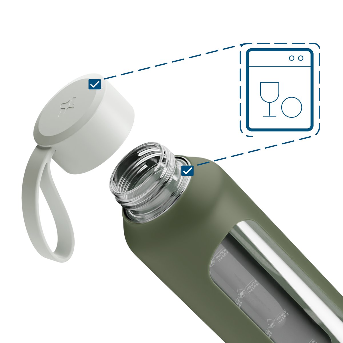 Nowoczesne i stylowe silikonowe etui wykonane zostało z tworzywa wolnego od BPA (BPA FREE). Czyni ono butelkę jeszcze bardziej poręczną, zapobiegając wyślizgiwaniu się z rąk.