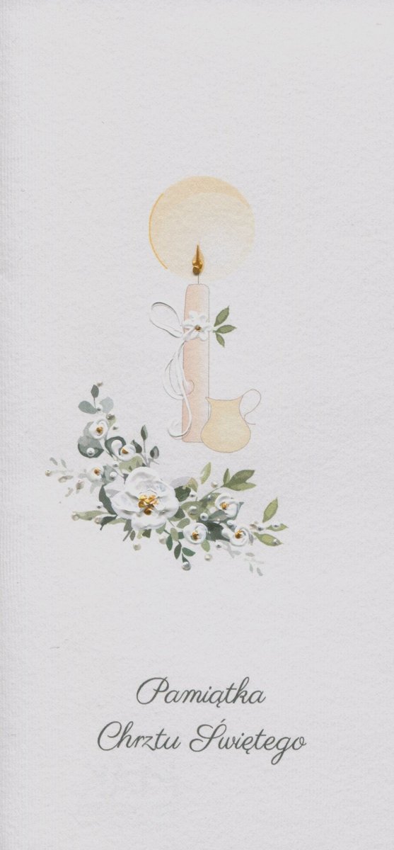 karnet z okazji Chrztu św. firmy MAK ręcznie malowany farbami akrylowymi wymiary: 21 cm x 10 cm papier biały, delikatnie tłoczony, matowy gramatura 200 g/ m2 w zestawie koperta i dodatkowa ...
