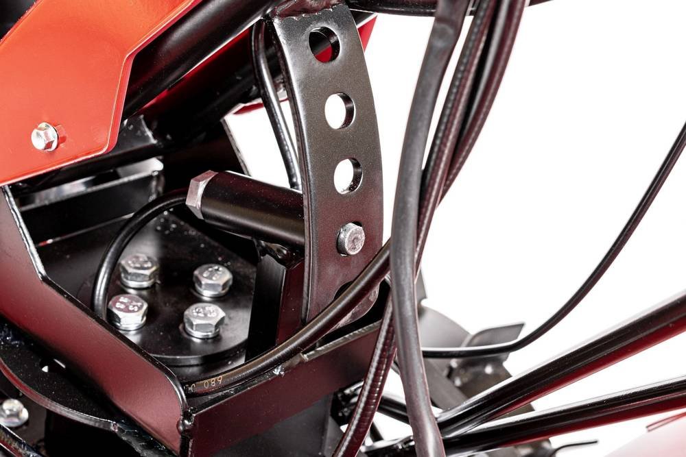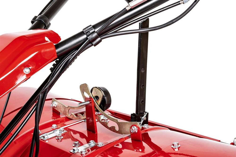 Glebogryzarka posiada koła transportowe, ułatwiające przemieszczanie się oraz regulowaną wysokość dźwigni sterującej, dzięki której można dostosować wysokość do wzrostu użytkownika.