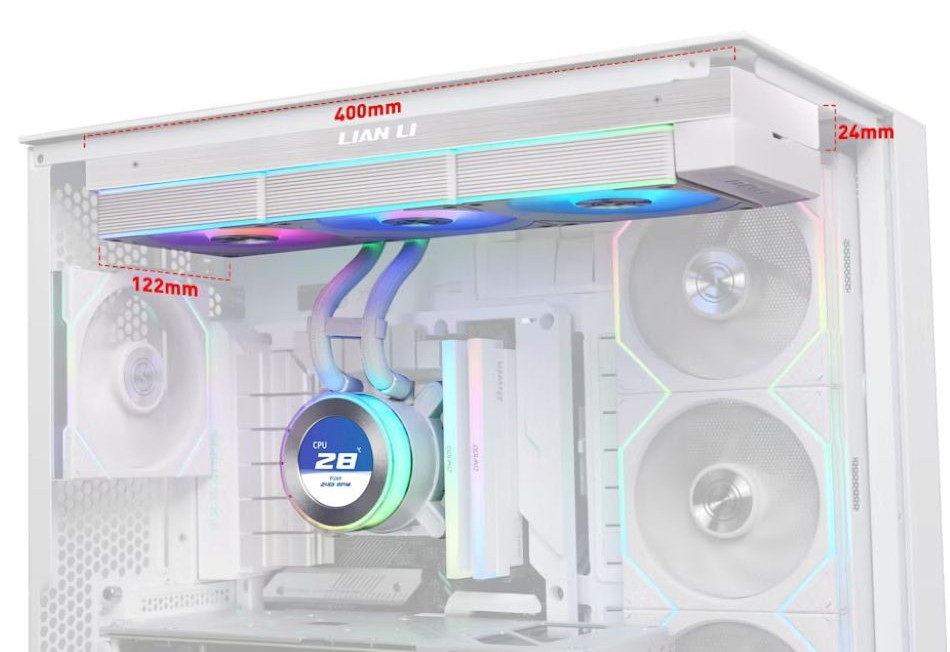 Aby odprowadzić ciepło z chłodzenia, radiator wykorzystuje pojedynczy falisty wzór finów. Zapewniając optymalny przepływ powietrza, chłodzenie to zawiera trzy wentylatory Lian Li Hydroshift LCD 360CL 120 mm. Każdy wentylator może wytworzyć przepływ powietrza na poziomie 72 CFM przy ciśnieniu statycznym 3,0 mmH2O, co jest idealne do stosowania z powierzchniami o dużym oporze, takimi jak radiator.
