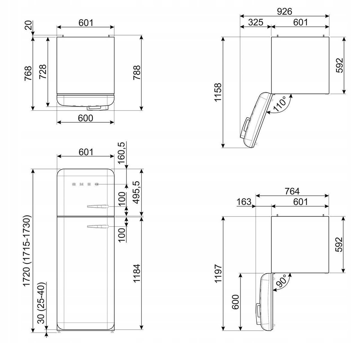 Szerokość produktu z maksymalnie otwartymi drzwiami 926