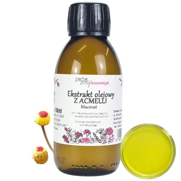 Ekstrakt olejowy z acmelli, znany również jako olej z acmelli o nazwie botanicznej Spilanthes acmella, jest cennym składnikiem w przemyśle kosmetycznym i medycynie naturalnej. Ekstrakt olejowy powstaje w wyniku maceracji rośliny w oleju. Kwiaty te są rośliną pochodzącą z Ameryki Południowej i często uprawianą w Brazylii i Indiach. W ekstrakcie olejowym z acmelli głównie wystepuje spilantol, który jest odpowiedzialny za wiele korzystnych właściwości tego oleju m.in przeciwzapalne, odmładzające i przeciwbakteryjne.
