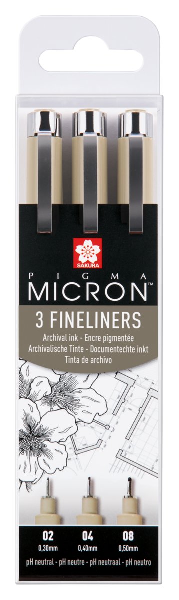 Zestaw cienkopisów Pigma Micron japońskiej marki Sakura. Polecane dla projektantów, rysowników komiksów oraz mangi, ilustratorów i hobbystów. Idealny do rysunków technicznych oraz artystycznych. Opatentowany przez firmę tusz Pigma nie przebija przez papier, jest wodoodporny i nie blaknie. Szybko schnie, może być wykorzystywany do lineartu przy ilustracji markerami wodnymi oraz alkoholowymi.
