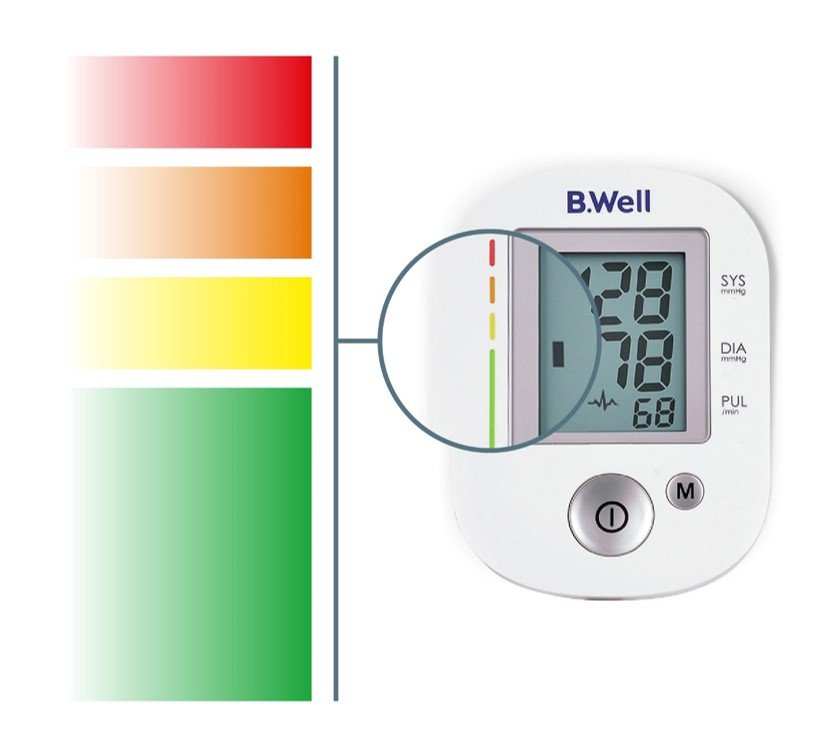 Kolorowe paski po lewej stronie wyświetlacza pokazują zakres, w którym znajdują się wskazane wartości ciśnienia krwi.