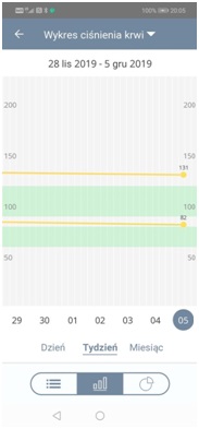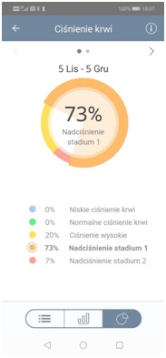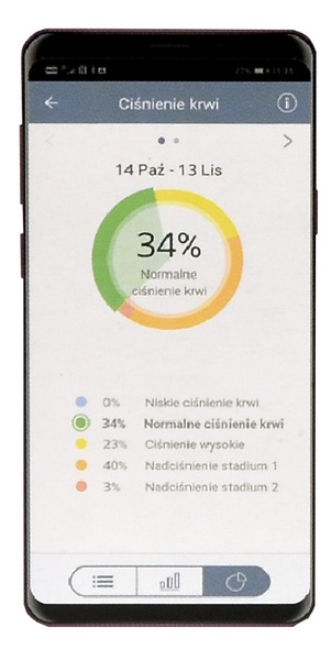 W związku z tym, że do pojedynczego wyniku pomiaru nie można przywiązywać zbyt dużej wagi, wyniki pomiarów (z wybranego okresu – dzień, tydzień, miesiąc lub inny okres) możesz zobaczyć również w formie wykresu liniowego, zestawienia procentowego, a także naniesione na skalę przedstawiającą klasyfikację ciśnienia tętniczego krwi według Światowej Organizacji Zdrowia – WHO i ISH. Taka prezentacja jest źródłem wiedzy dla Ciebie i Twojego lekarza o uśrednionych wynikach Twoich pomiarów. Pomaga np. ocenić jaki wpływ na wyniki miała zastosowana terapia lekowa.