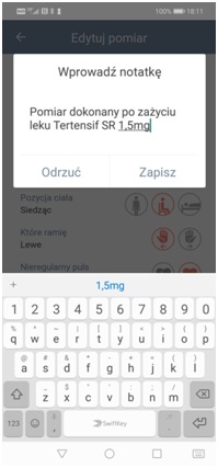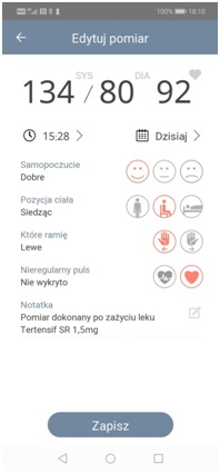 Każdy otrzymany wynik możesz szczegółowo opisać za pomocą znormalizowanych parametrów: samopoczucie, pozycja ciała w czasie pomiaru, ramię na którym wykonany został pomiar, czy w trakcie pomiaru wystąpiła arytmia, wybierając odpowiednią ikonę. Możesz dodać również notatkę np. na temat przyjmowanych leków.