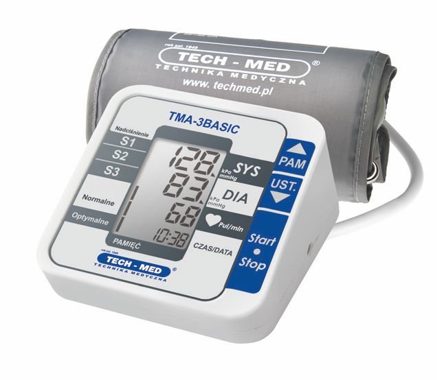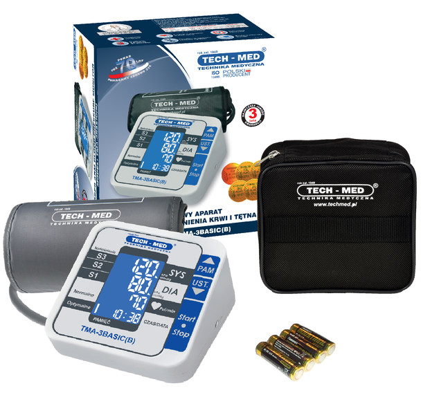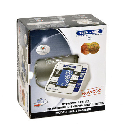 TECH-MED TMA-3 BASIC (B) to nowoczesny ciśnieniomierz elektroniczny, w którym zastosowano oscylometryczną metodę pomiaru z zastosowaniem technologii MWI (Measuring While Inflating). Ciśnieniomierz charakteryzuje się wysoką dokładnością pomiaru – równorzędną dokładności pomiarów dokonywanych metodą osłuchową za pomocą sphygmomanometrów mechanicznych przez wykwalifikowany personel medyczny. Dokładność ta została potwierdzona badaniami klinicznymi. Wykonanie dokładnego pomiaru ciśnienia jest niezwykle proste – wymaga przyciśnięcia tylko jednego przycisku. Ergonomiczny wyświetlacz LCD zapewnia łatwy odczyt wyniku pomiaru