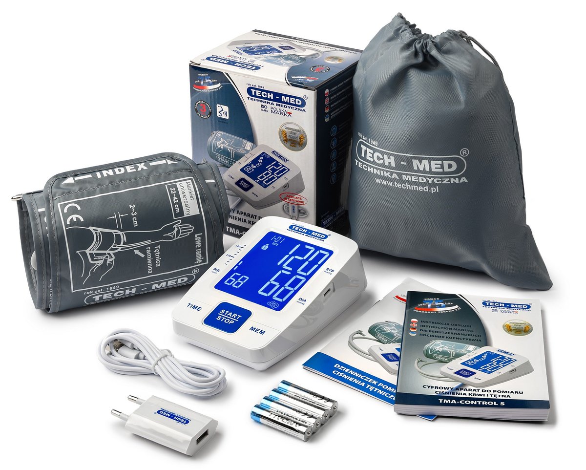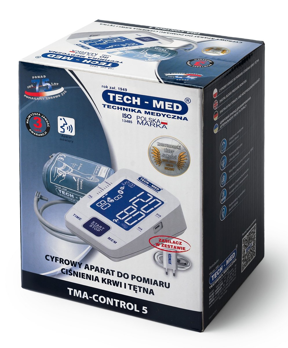TECH-MED TMA-CONTROL 5 to w pełni automatyczny ciśnieniomierz naramienny z funkcją głosową i dużym, czytelnym ekranem. Umożliwia precyzyjny pomiar ciśnienia i pulsu, a dzięki funkcji mowy – ułatwia obsługę osobom starszym i niedowidzącym.