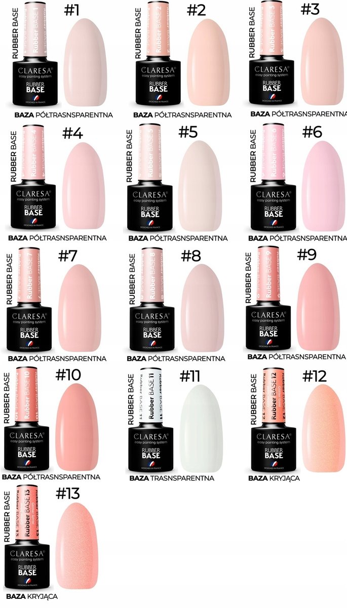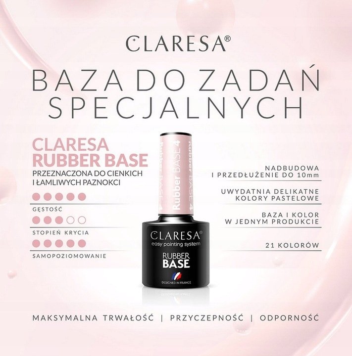✅ Bazę kauczukową CLARESA można zastosować jak standardową bazę pod hybrydę, nadbudować nią uszkodzony paznokieć, wyrównać wszelkie nierówności płytki oraz wyrównać koloryt.