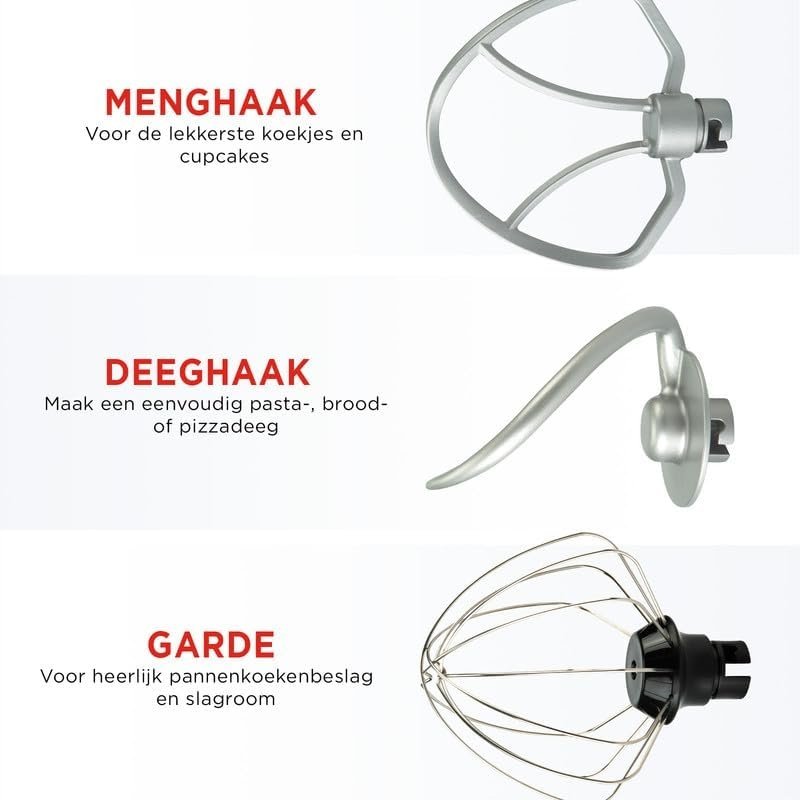 Robot kuchenny jest wszechstronny dzięki takim elementom jak hak do mieszania, hak do wyrabiania ciasta i trzepaczka.