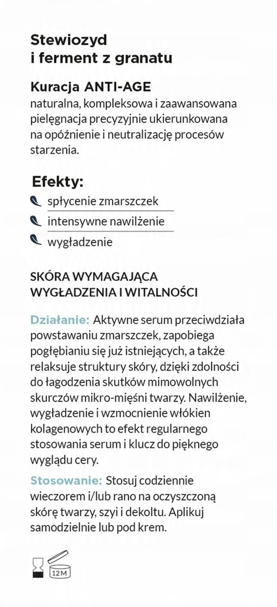 Aktywne serum przeciwdziała powstawaniu zmarszczek, zapobiega pogłębianiu się już istniejących, a także relaksuje struktury skóry, dzięki zdolności do łagodzenia skutków mimowolnych skurczów mikro-mięśni twarzy. W składzie serum Simply Nature zastosowano antyoksydant, który spowalnia procesy starzenia się skóry, którym jest bioferment z owocu granatu. Poprawia on strukturę skóry. Tworzy ochronny płaszcz. Usuwa szkodliwą florę bakteryjną. W serum przeciwzmarszczkowym znajduję się jeszcze Stewiozyd – roślinny składnik aktywny, działający jak naturalny botoks. Ponadto nawilżenie, wygładzenie i wzmocnienie włókien kolagenowych to efekt regularnego stosowania serum i klucz do pięknego wyglądu cery.