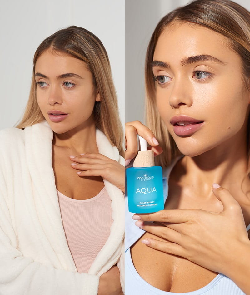 - Połączenie kwasu hialuronowego o 8 wyjątkowych masach cząsteczkowych, Aquaxyl™, prebiotyków i ekstraktu z kokosa