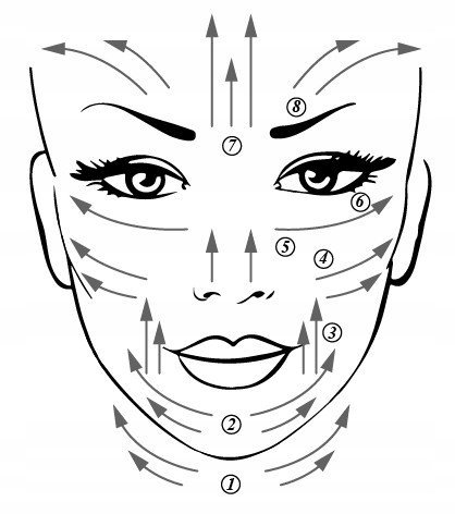 Twarz: Roluj po kościach policzkowych, ustach i brodzie tą samą podstawową metodą co czoło i oczy. Zaczynając od środka twarzy (obok nosa, pośrodku górnej wargi lub pośrodku brody), przetaczaj na zewnątrz w kierunku uszu. Powtórz 5 razy z każdej strony.