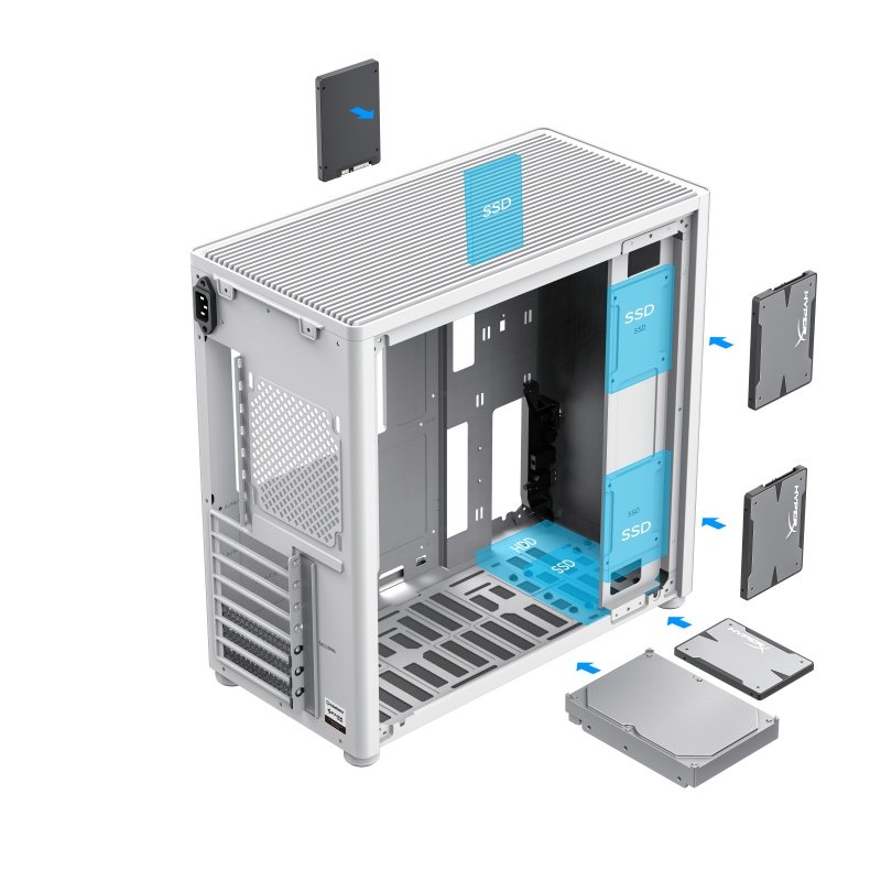 Wymienne panele boczne ze szkła i panele boczne z otworami zapewniają dodatkowe kanały przepływu powietrza do odprowadzania ciepła i obsługują chłodzenie wodne 240 oraz chłodzenie powietrzem o wysokości do 168 mm.