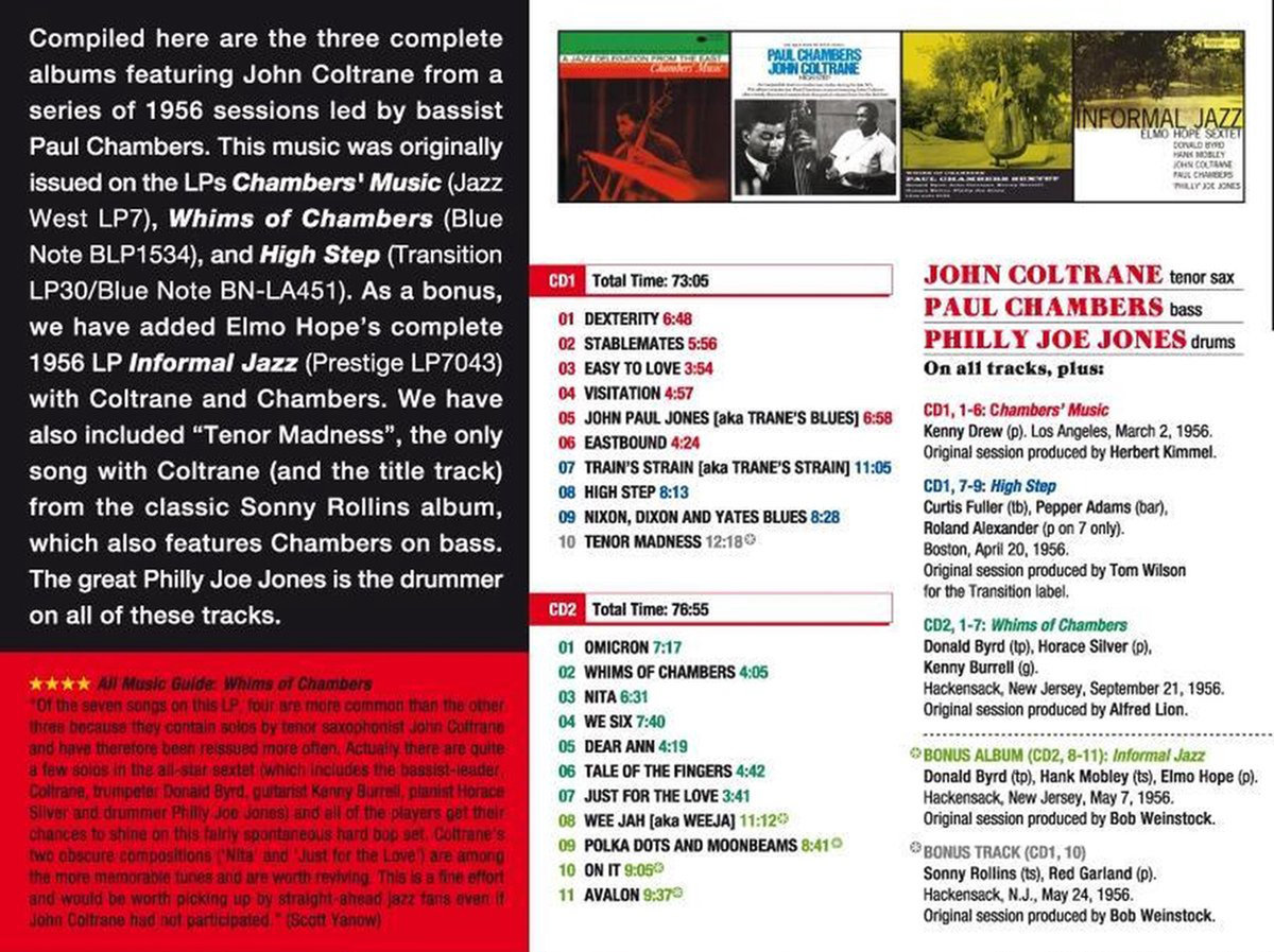 Ta muzyka została pierwotnie wydana na płytach LP "Chambers’ Music" (Jazz West LP7), "Whims of Chambers" (Blue Note BLP1534) i "High Step" (Transition LP30/Blue Note BN-LA451). Jako bonus ,dodano kompletny album Elmo Hope z 1956 r. "Informal jazz" (Prestige LP7043) z Coltranem i Chambersem. Niezbędna klasyka jazzu.