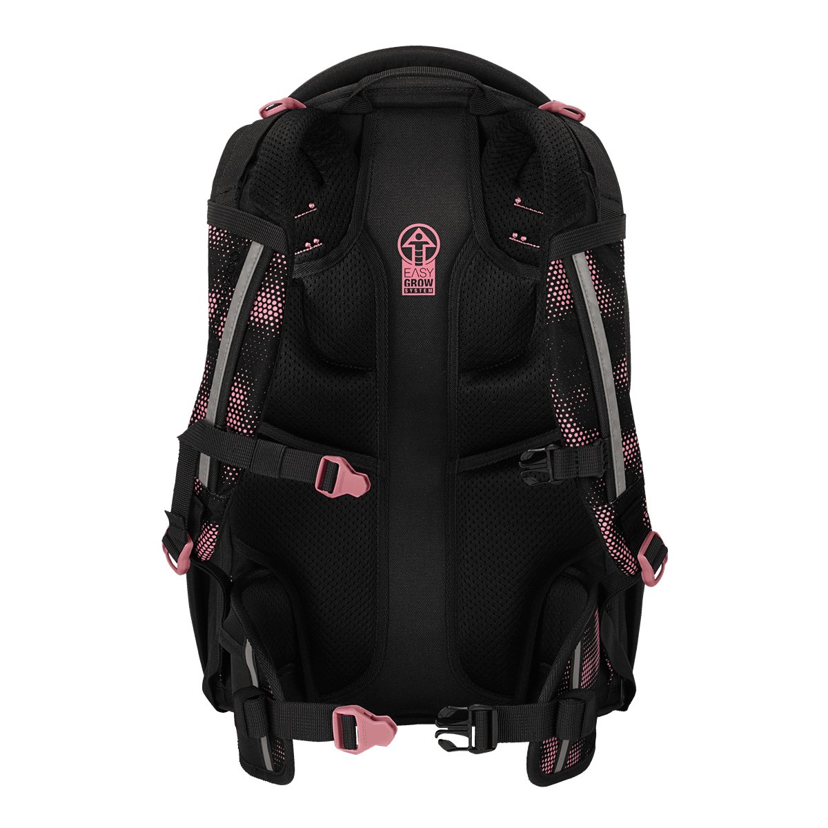 System Easy Grow to wzór na zdrowe plecy i wygodę. Dzięki wbudowanej regulacji umożliwia indywidualne dopasowanie plecaka do osoby o wzroście od 135 do 180 cm. Zaznaczone na szelkach kropki wyznaczają optymalną wysokość położenia szelek.