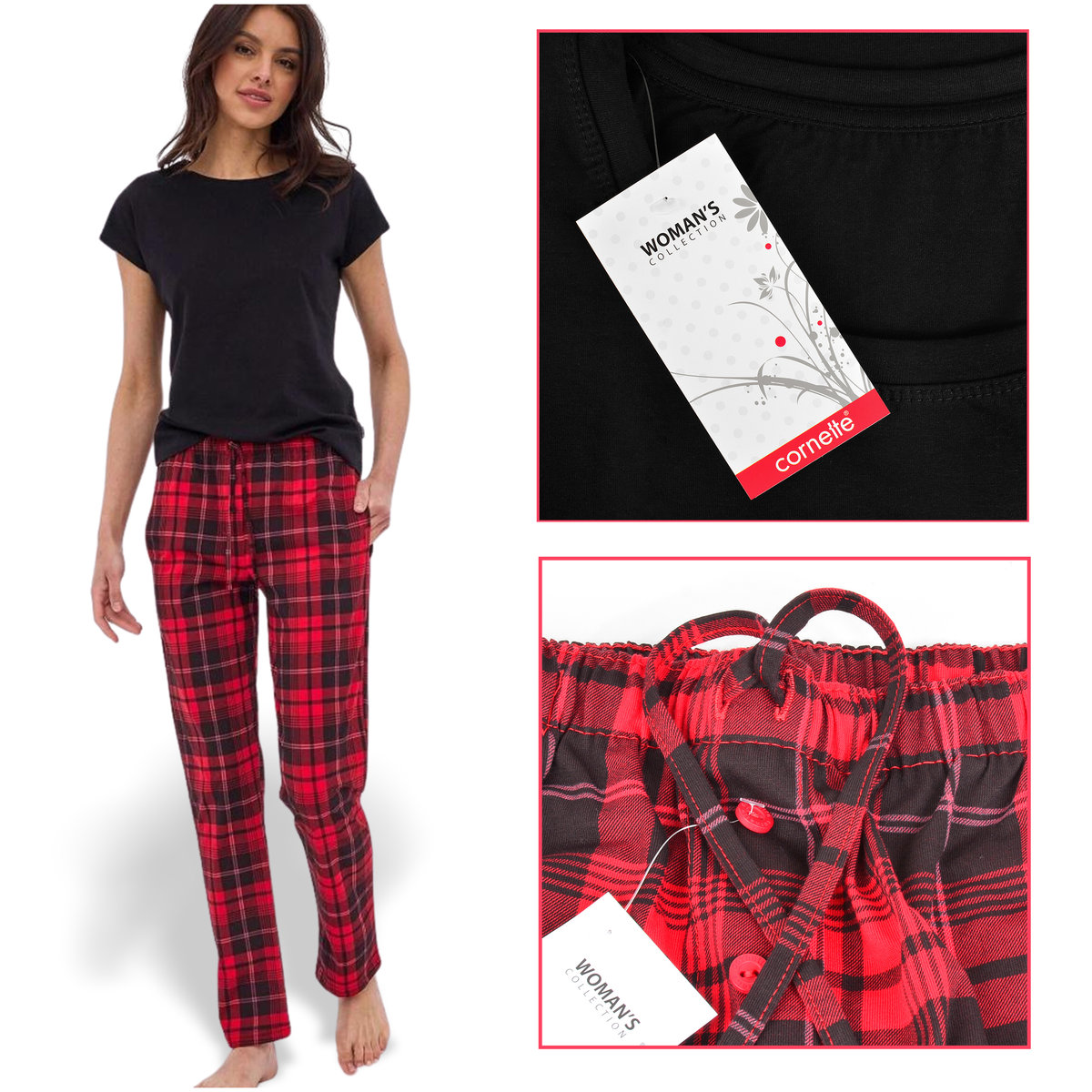 CORNETTEPiżama Damska ZestawSkład:Spodnie: 100% BawełnaKoszulka: 95% Bawełna, 5% ElastanRozmiar SSpodnie:Szerokość w gumce bez naciągania: ok 32 cmSzerokość w gumce z naciąganiem: ok 41 cmDługość ...