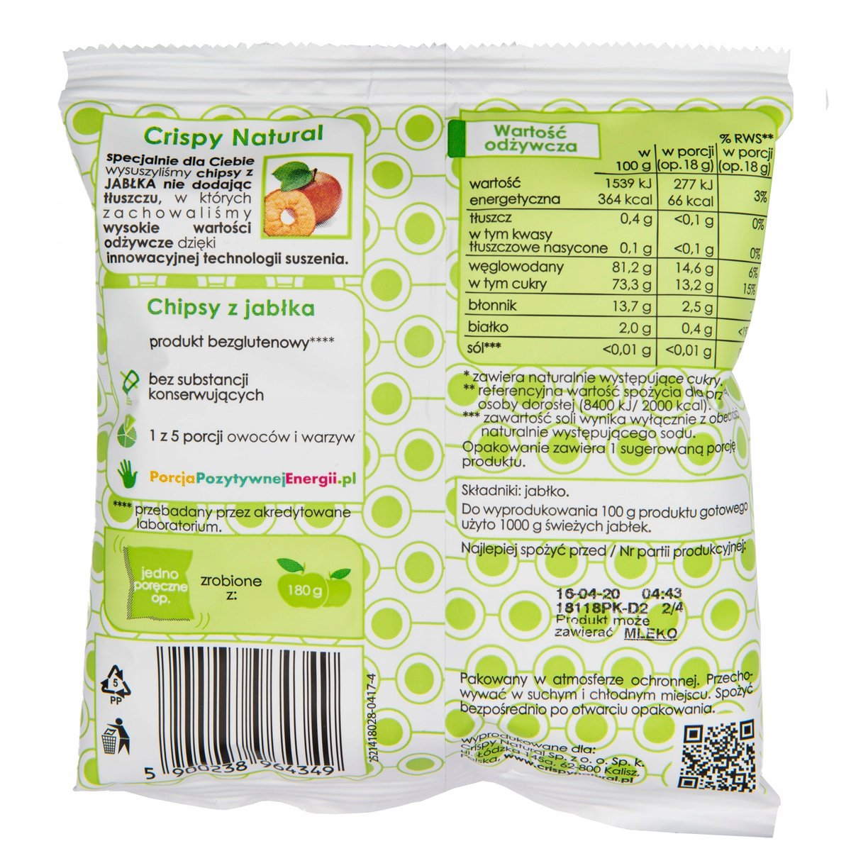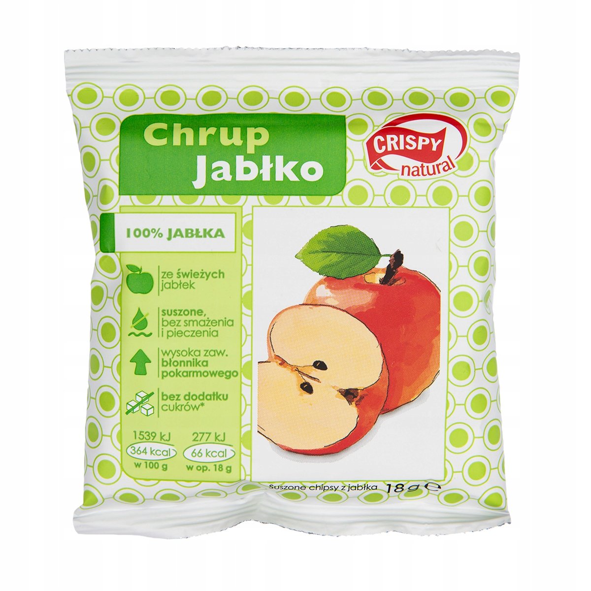 Polska słynie z najlepszych jabłek, a chipsy z jabłek to specjalność Crispy Natural. Naturalne walory polskich jabłek zostały zawarte w pysznych i mocno chrupiących plasterkach. Teraz po bogate w składniki odżywcze i błonnik jabłka podane w formie chipsów można sięgać już w każdym miejscu o każdej porze roku i dnia. Zawartość opakowania 18 g – zrobiona jabłek o łącznej wadze 180 g. Produkt bogaty w błonnik, bez glutenu i bez konserwantów, nie zawiera tłuszczu, odpowiedni dla wegetarian. Zawartość opakowania może stanowić 1 z 5 porcji owoców i warzyw zalecanych do spożycia w ciągu dnia.
