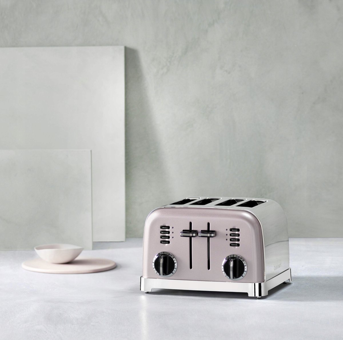 Stylowy toster z 4 szczelinami z pastelowo-różowym wykończeniem i polerowanymi chromowanymi detalami